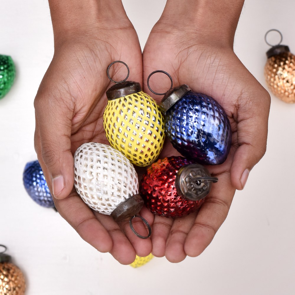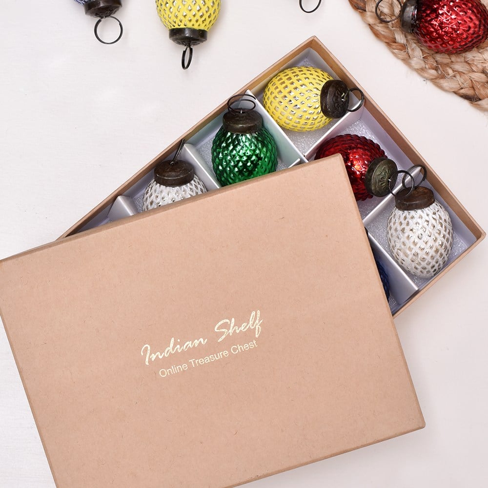 Buy Multicolor glass Christmas ornaments which are unique and handcrafted masterpiece. Crafted by highly skilled Indian artisans, these ornaments are a celebration of craftsmanship, tradition, and elegance. These stunning ornaments come in a variety of shapes, from classic spheres to intricate designs, ensuring a diverse and captivating display on your Christmas tree. The lush multi- colours blend harmoniously, adding a touch of opulence to your holiday decorations. Versatile and enchanting, these ornaments aren't just limited to Christmas. They make a delightful addition to weddings, bridal showers, and other special occasions, elevating the ambiance with their radiant charm. Hang them in your home or garden to infuse every space with a touch of festive cheer. These handcrafted treasures also make for exceptional gifts. Share the joy and craftsmanship with your loved ones on special or festive occasions, leaving a lasting impression of your thoughtfulness and appreciation for beauty.