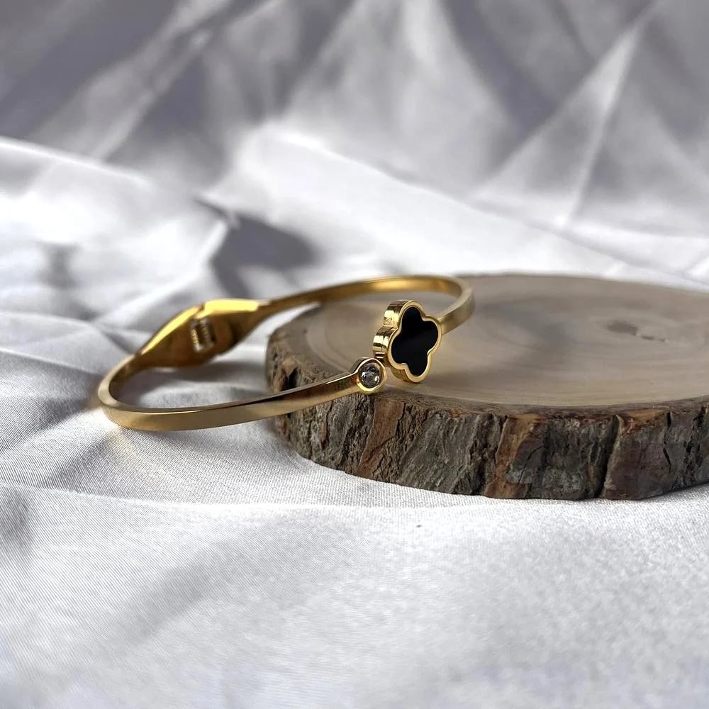 The 18K Gold Plated Black Cubic Zirconia Inspired Kada is designed around contrast. Deep black zirconia tones meet a warm gold finish, creating a piece that feels modern, controlled, and confident. The design draws attention without relying on excess shine, making it ideal for everyday statement wear. It reflects a balance between sharp aesthetics and wearable elegance.