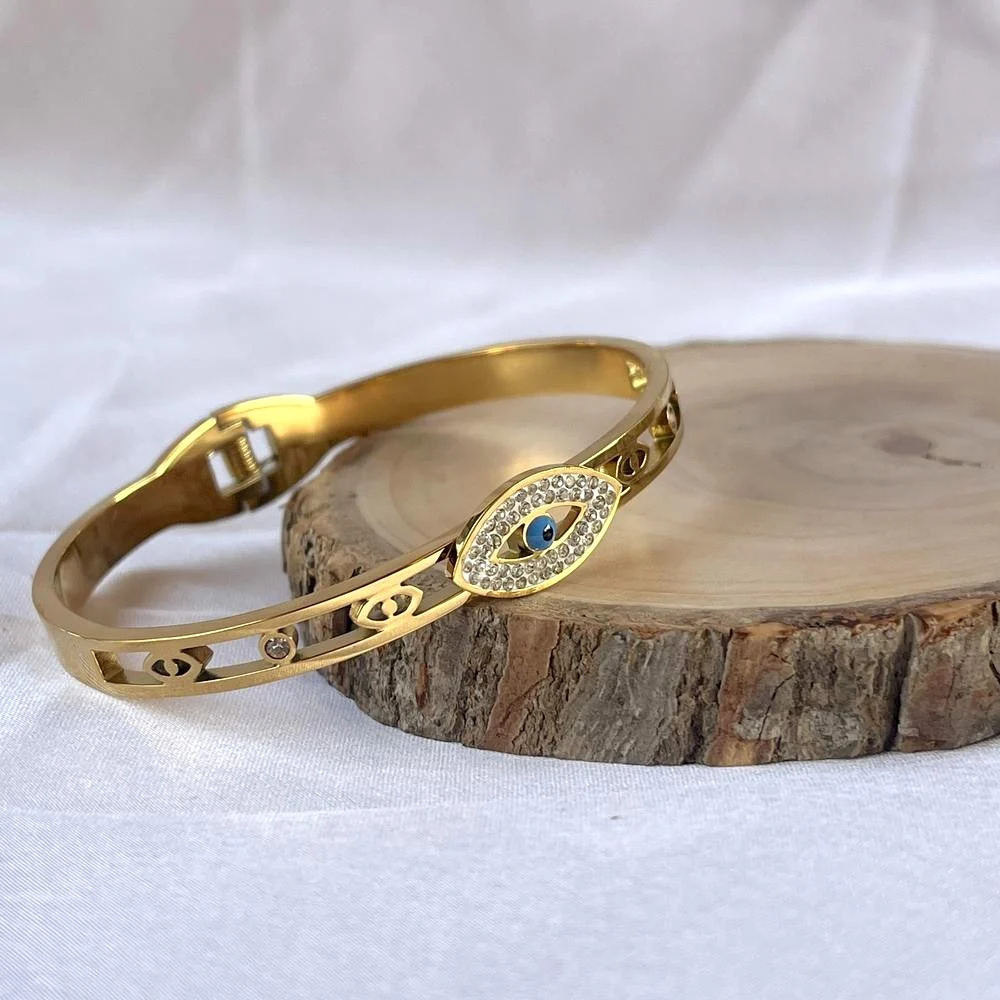 The 18K Gold Plated Bold Evil Eye Kada is crafted for those who value strength, symbolism, and standout design. Made from durable stainless steel and finished with rich 18K gold plating, this kada features a bold evil eye motif designed to command attention while carrying protective meaning. Its solid, structured form offers a confident wrist presence suitable for everyday wear. Blending spiritual symbolism with modern aesthetics, this piece feels powerful, stylish, and enduring.