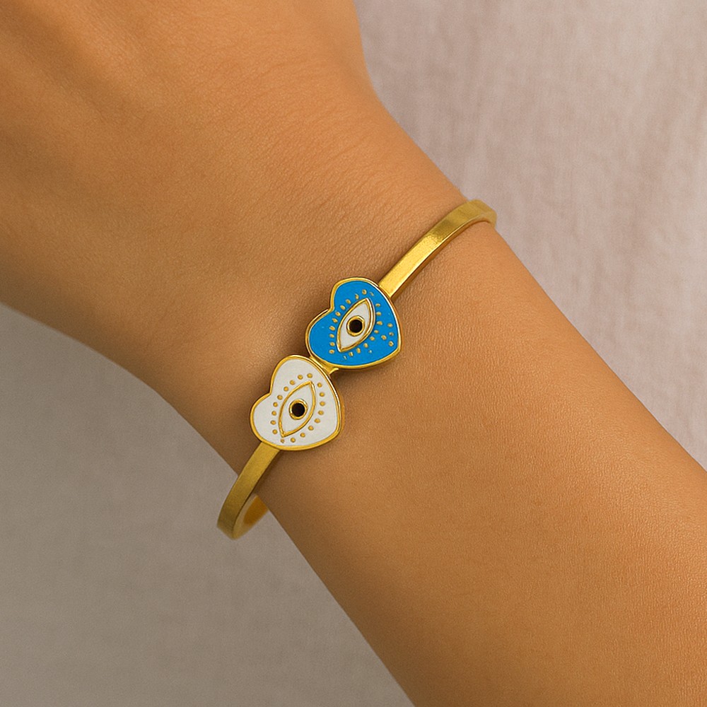 The 18K Gold Plated Dual Heart Evil Eye Kada unites symbolism and sentiment in a clean, contemporary form. Two heart motifs frame the evil eye, bringing together themes of protection, connection, and emotional strength. Finished in a warm gold tone, the design feels intentional rather than decorative. It is crafted for those who value meaning woven quietly into everyday style.