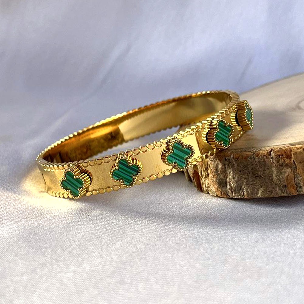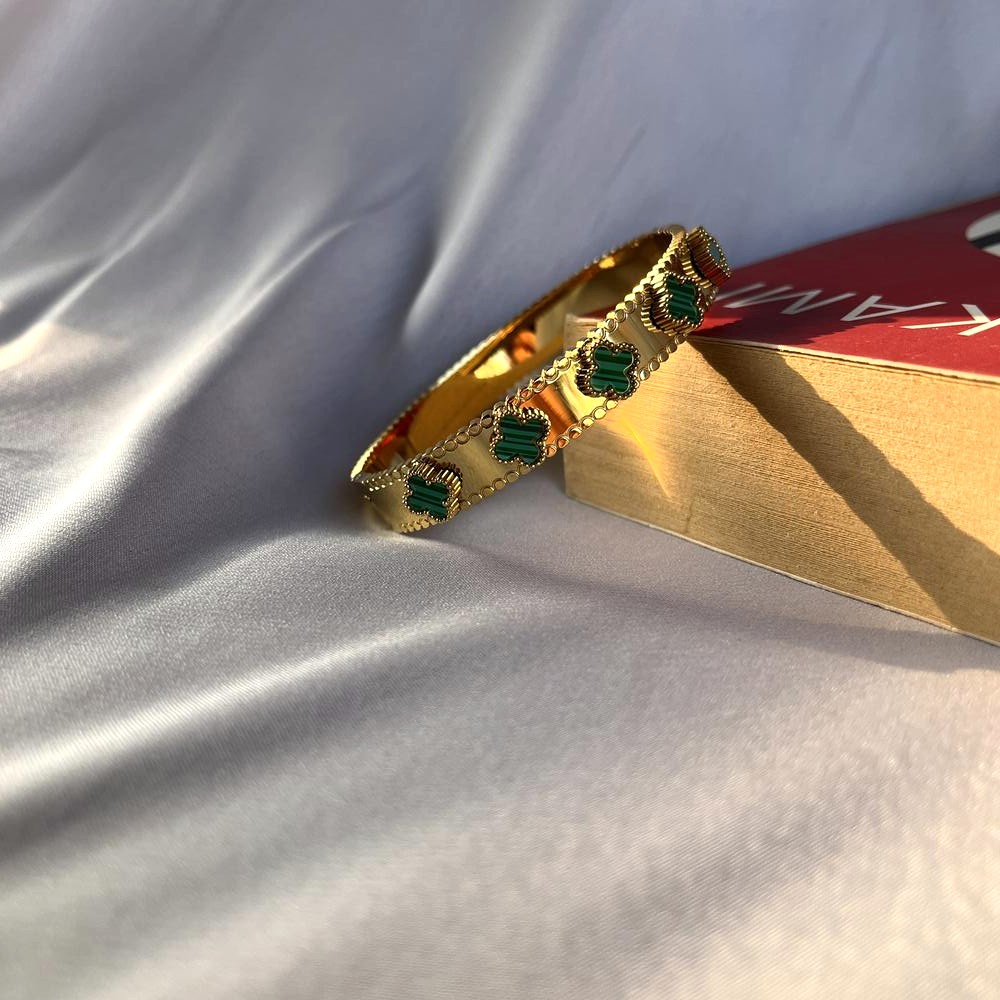 The 18K Gold Plated Emerald Floral Inspired Kada blends botanical elegance with modern durability. Crafted from stainless steel and finished in radiant 18K gold plating, this kada features floral-inspired detailing highlighted with emerald-toned accents. The structured silhouette offers a confident wrist presence while remaining comfortable for daily wear. Designed to elevate both traditional and contemporary looks, it feels graceful, luminous, and timeless.
