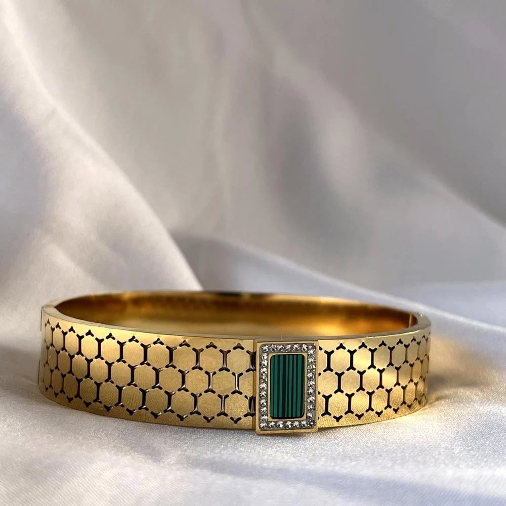 Striking in color and confident in form, the 18K Gold Plated Emerald Green Zirconia Kada is designed to make an impression. Crafted from stainless steel and finished in a radiant gold tone, this kada features emerald green zirconia that catches light with refined brilliance. The structured silhouette balances traditional inspiration with contemporary polish. It’s a piece that speaks of elegance, confidence, and enduring style.