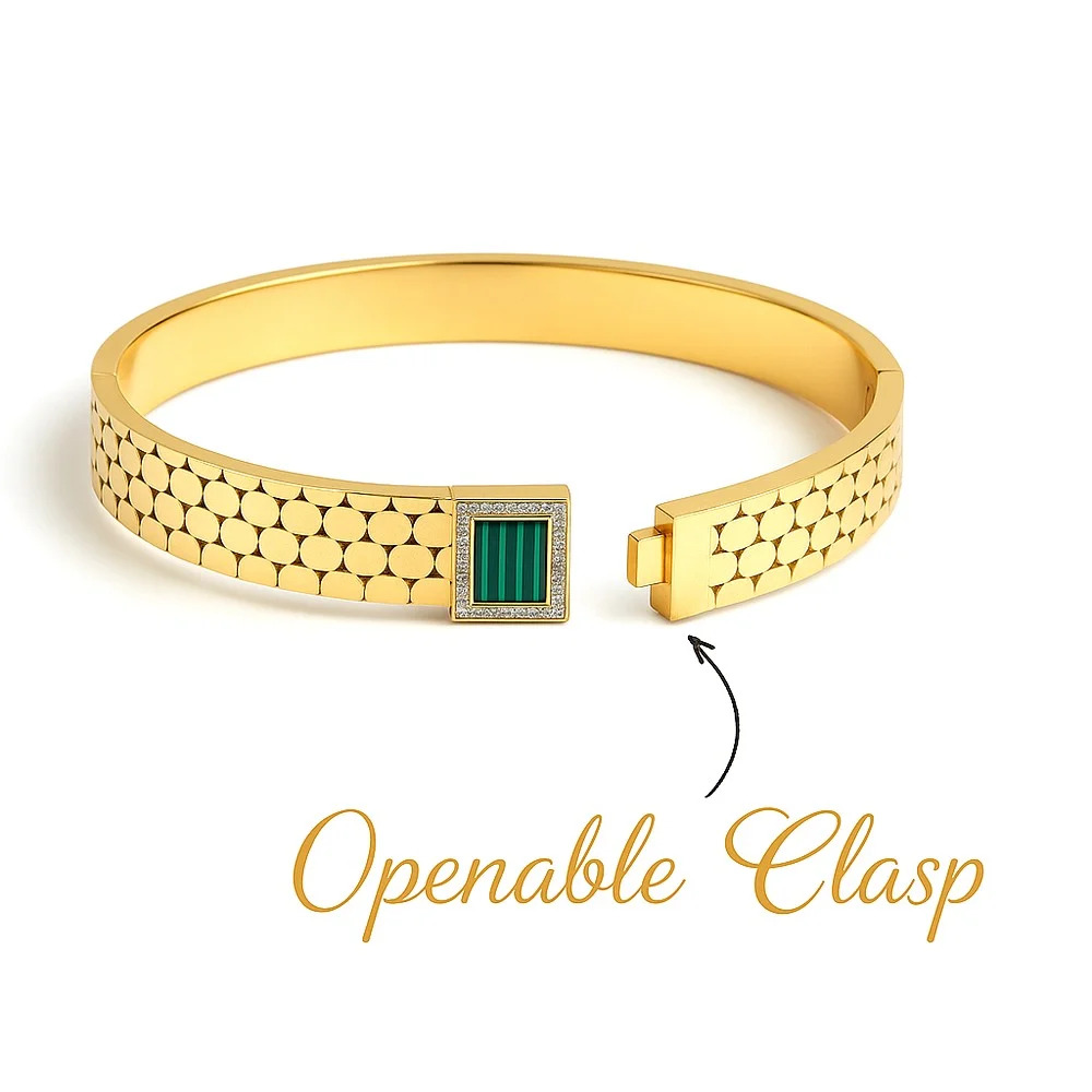 The kada features emerald green zirconia stones crafted for durability and consistent brilliance.