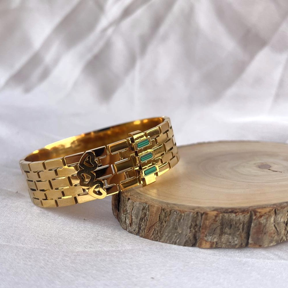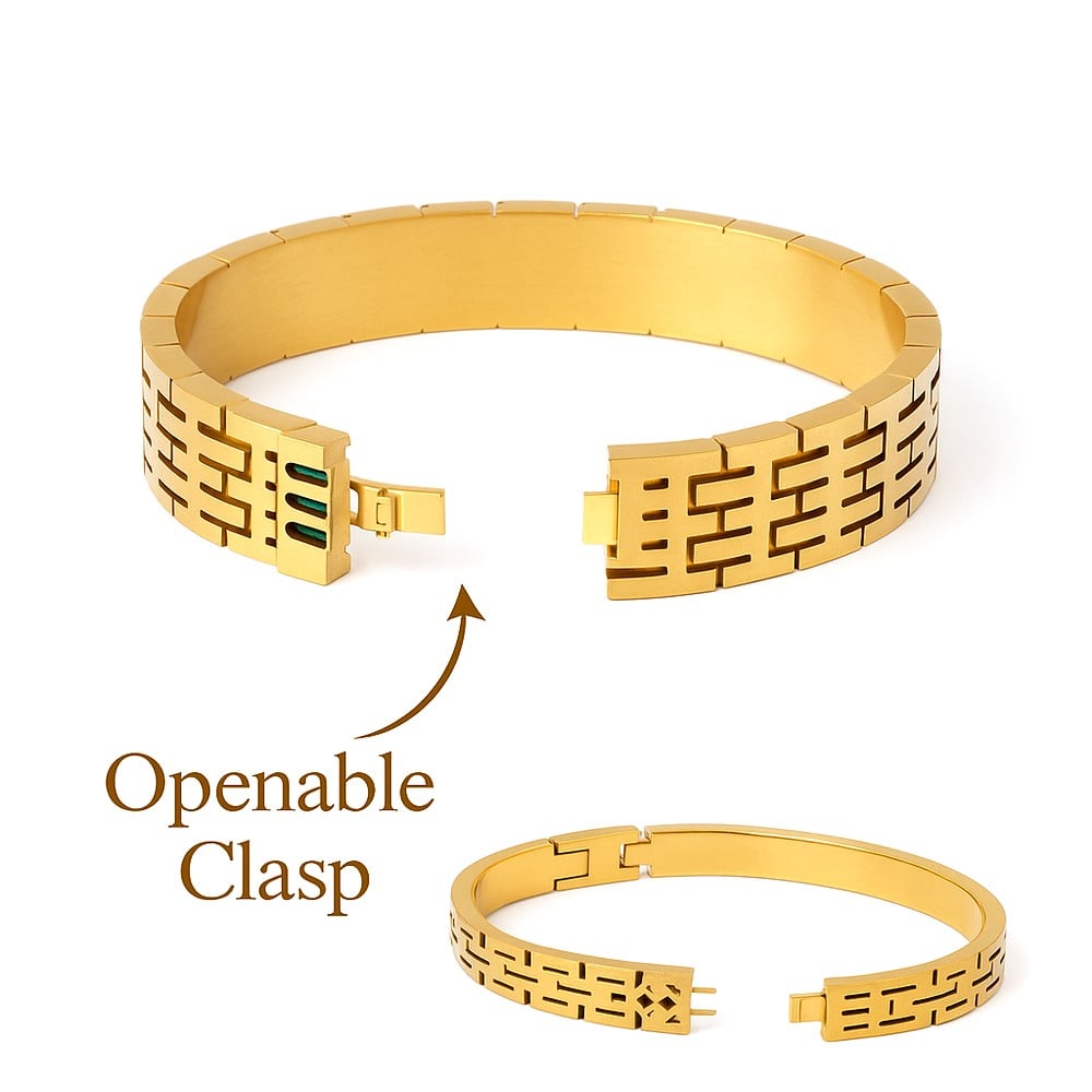 The 18K Gold Plated Emerald Mesh Chain Kada brings contemporary design into a timeless form. Crafted to reflect confidence and restraint, its structured mesh silhouette draws inspiration from modern jewelry architecture rather than ornament-heavy tradition. The gold tone finish adds warmth and depth, creating a piece that feels bold yet refined. This kada is designed for those who prefer presence without excess.