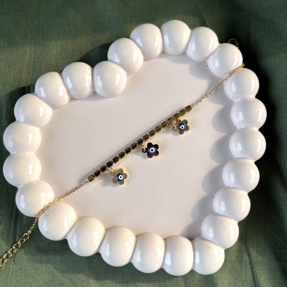 Soft floral detailing meets ancient symbolism in the 18K Gold Plated Floral Evil Eye Tennis Bracelet. Crafted from stainless steel and finished in a luminous gold tone, this bracelet reimagines the classic evil eye through delicate, flower-like motifs. Each element flows seamlessly into the next, creating a gentle rhythm of shine and form around the wrist. It feels elegant, feminine, and quietly powerful.