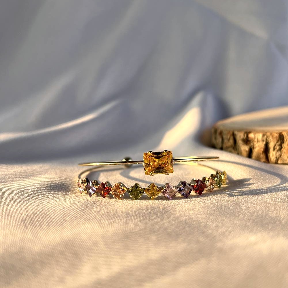 The 18K Gold Plated Navratan Multistone Kada is a timeless expression of tradition blended with modern durability. Crafted from stainless steel and plated with rich 18K gold, this kada features the classic Navratan arrangement—nine symbolic stones revered in Indian culture for harmony and balance. The structured silhouette offers a bold yet refined presence on the wrist. Designed for everyday strength and ceremonial elegance, it carries cultural meaning with contemporary wearability.