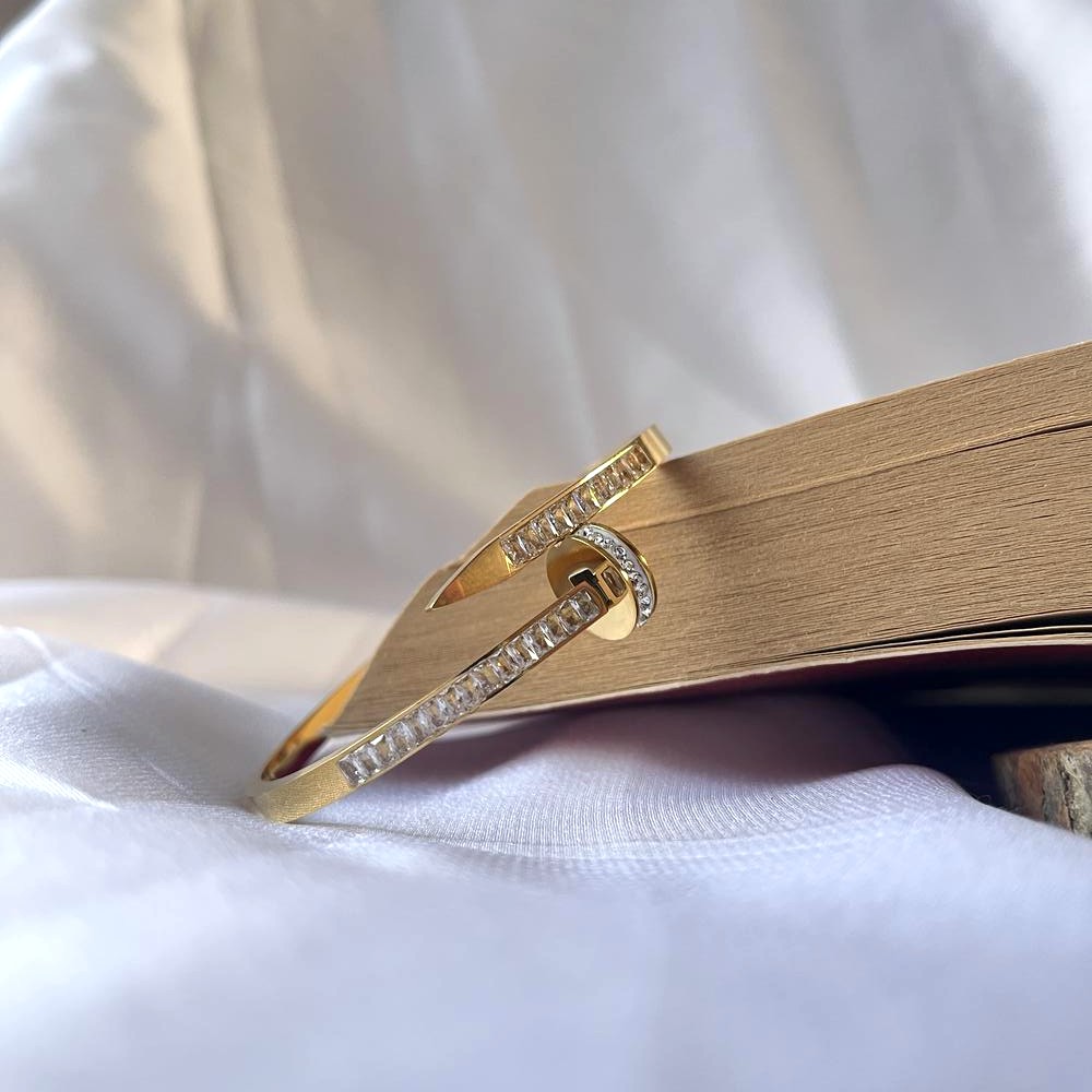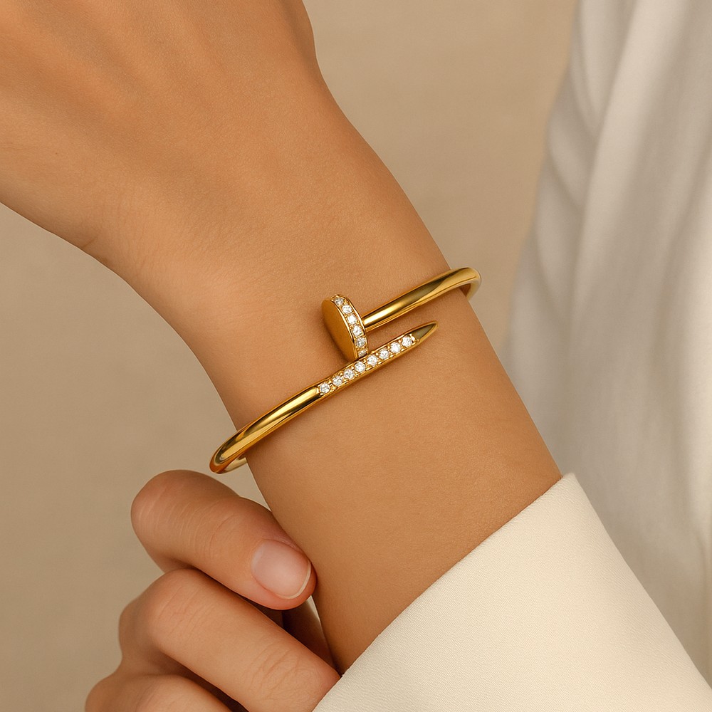 The 18K Gold Plated Studded Nail Kada Bracelet transforms a raw industrial form into a refined statement accessory. Inspired by the strength and symbolism of the nail motif, this design blends modern attitude with polished elegance. The studded surface adds texture and character, while the gold finish brings warmth and sophistication. It is crafted for those who appreciate design that speaks quietly yet confidently.