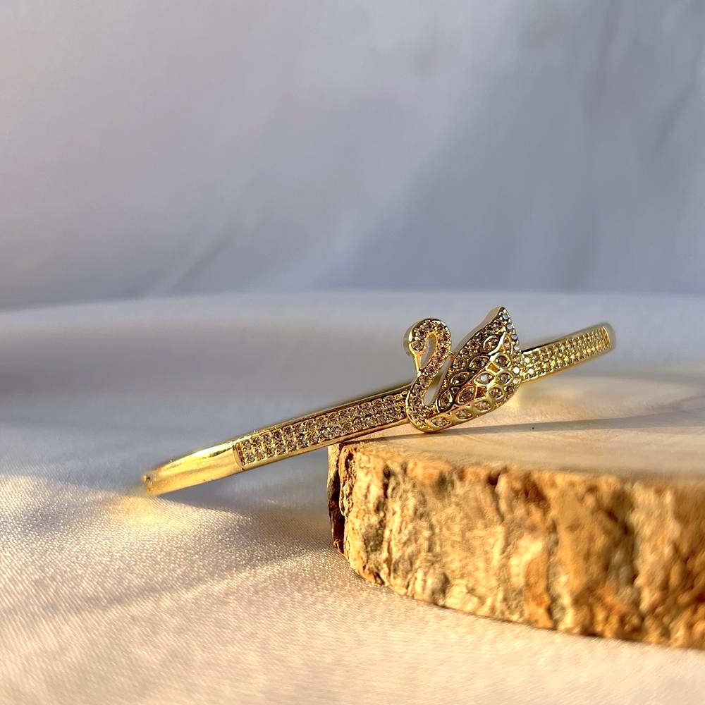 The 18K Gold Plated Swan Cubic Zirconia Kada is a refined expression of elegance inspired by the timeless beauty of the swan. Crafted from durable stainless steel and finished with rich 18K gold plating, this kada features a sculpted swan motif adorned with shimmering cubic zirconia stones. The design balances softness and strength, offering a graceful wrist presence that’s comfortable for everyday wear. Perfect for those who love symbolic luxury with a modern touch, it feels poised, radiant, and enduring.