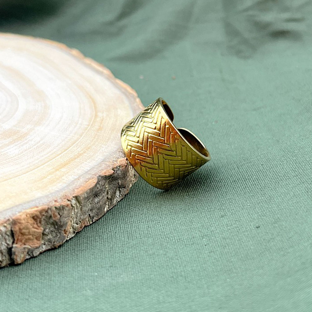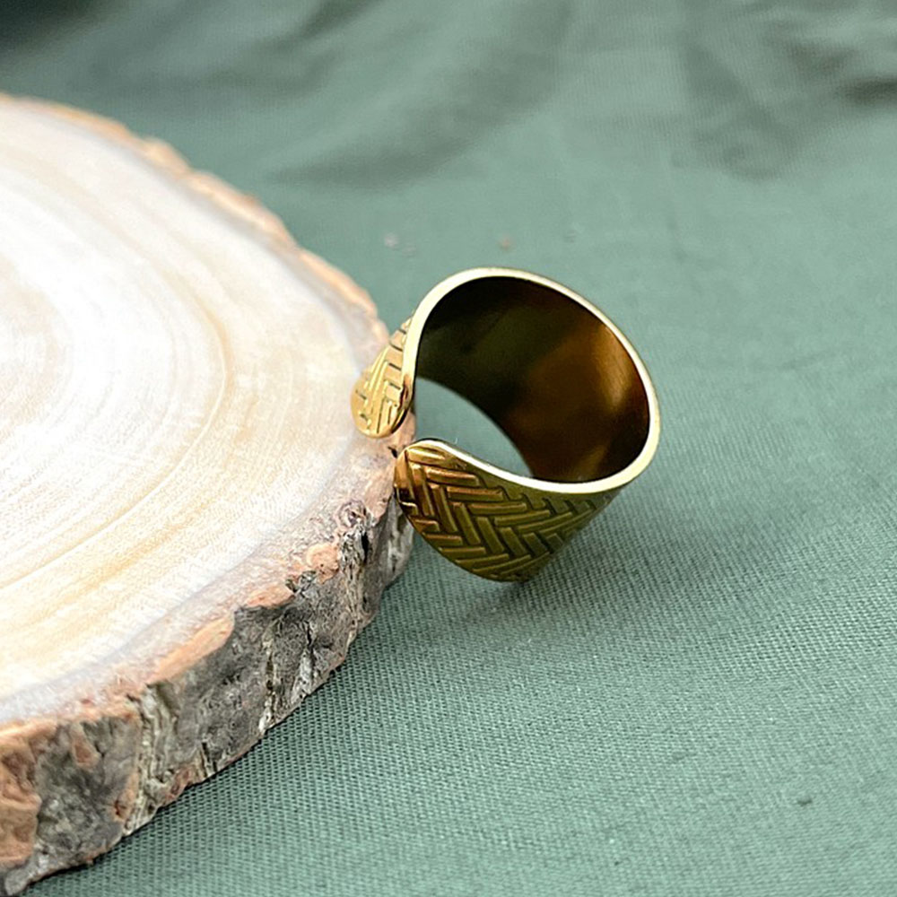 This 18K Gold Plated Textured Adjustable Statement Band Ring is designed for bold simplicity with a refined finish. Crafted on a stainless steel base and plated with luminous 18K gold, the textured surface catches light in subtle, shifting patterns. The design balances contemporary minimalism with a sculptural feel, making it expressive without excess. Adjustable and comfortable, it’s a statement that fits your hand—and your mood—effortlessly.