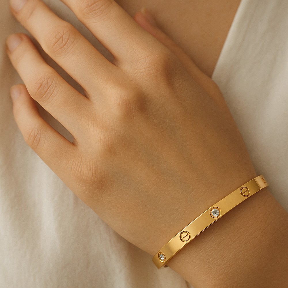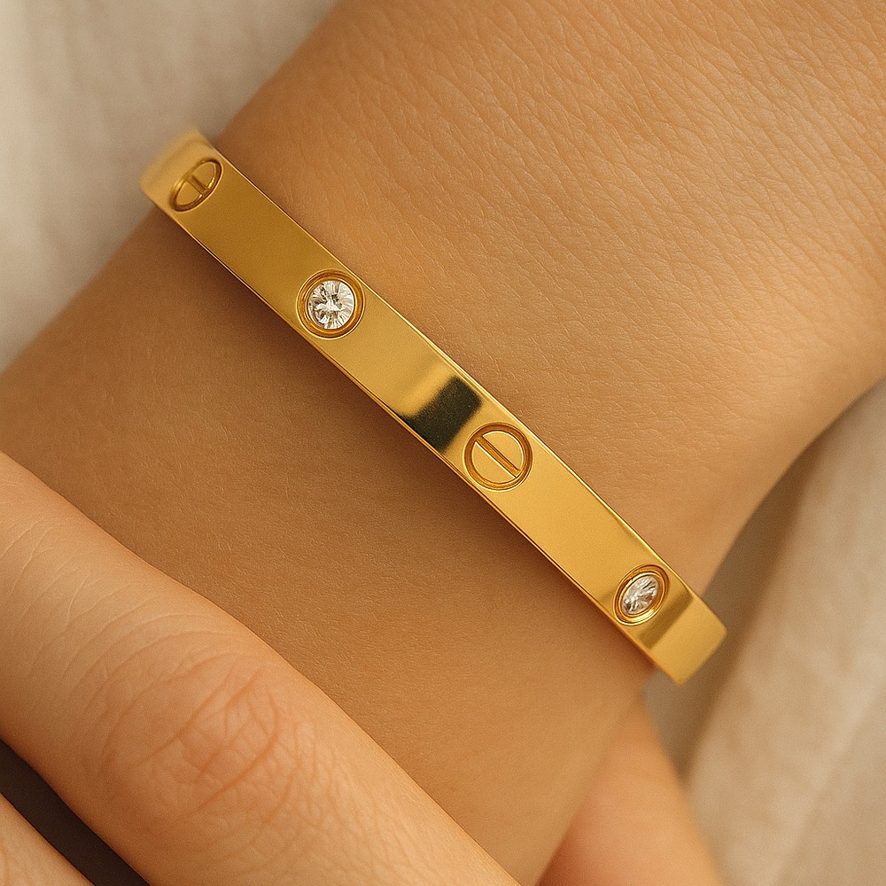 Inspired by Cartier's iconic design, this unisex bracelet blends sleek lines and 18K gold plating for a modern yet timeless statement suitable for everyone.