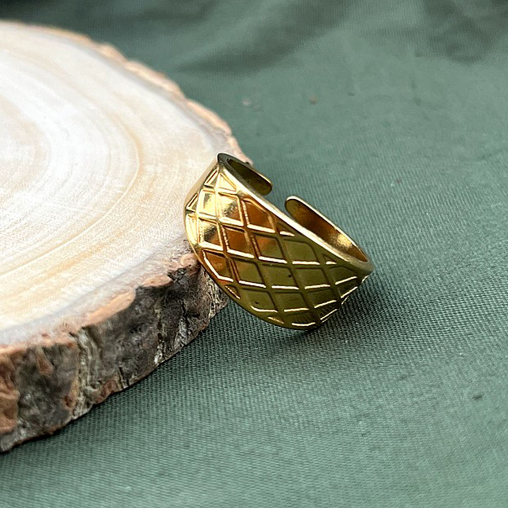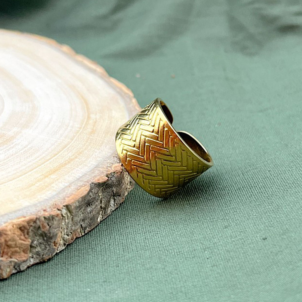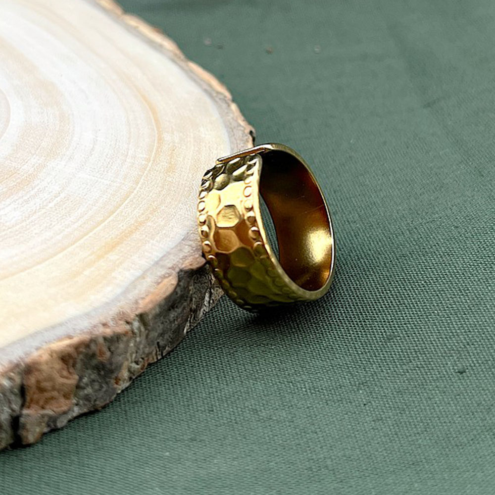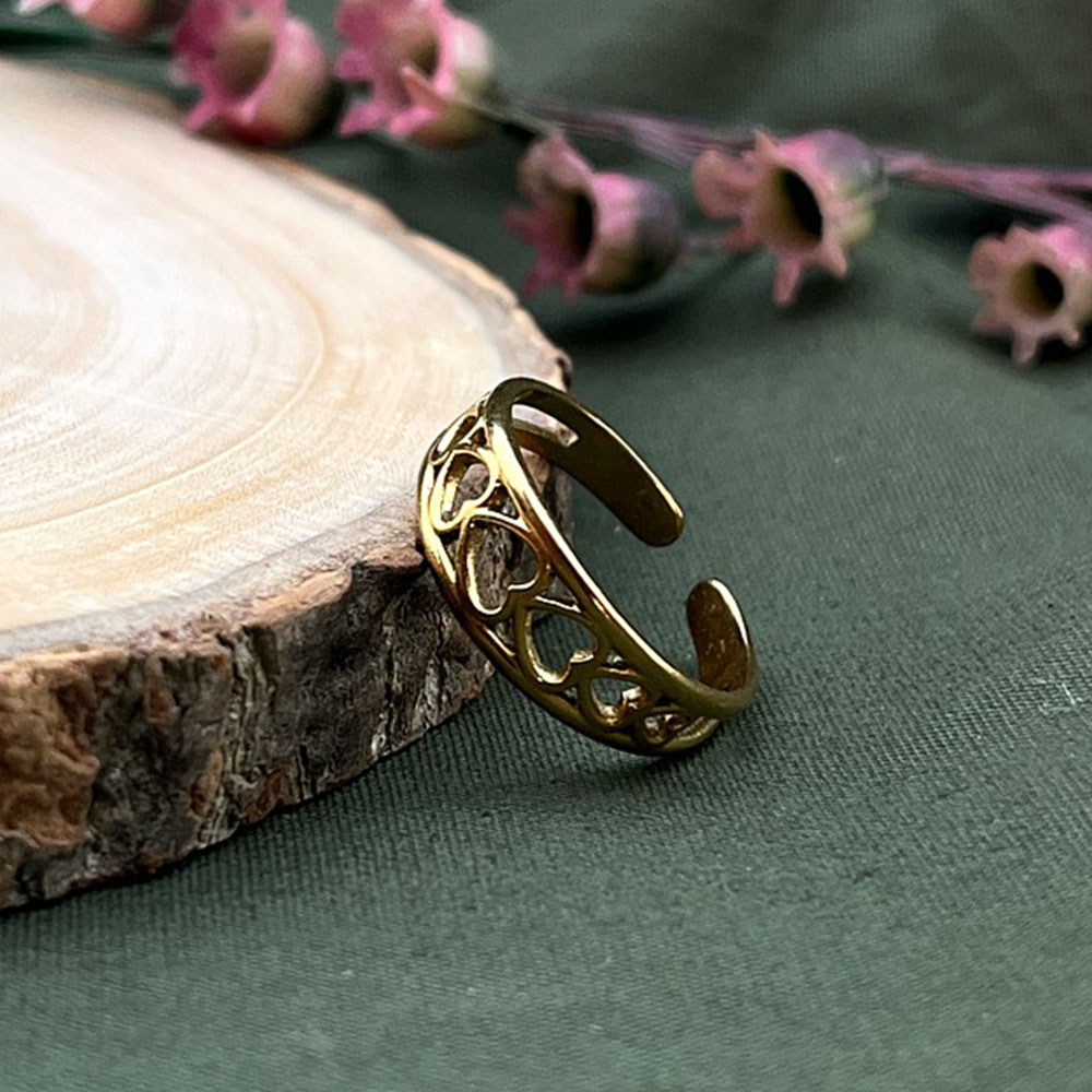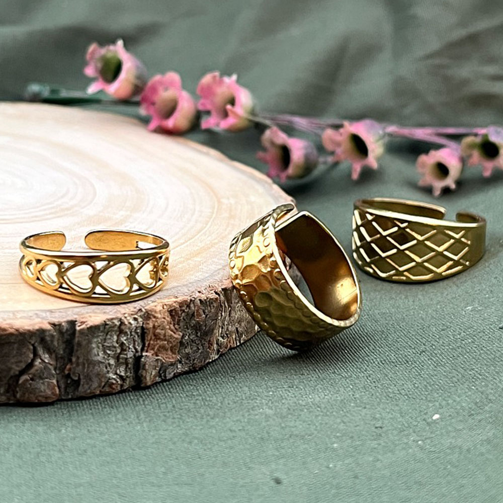 This demi fine three piece ring set features adjustable stainless steel bands finished in radiant 18K gold plating. Designed for all season styling, the set includes a heart cutout ring, a hammered texture ring, and a mesh patterned bandeach crafted for lightweight comfort and everyday elegance. Perfect for dressing up or down across any style mood. Packed and quality checked by Indianshelf.