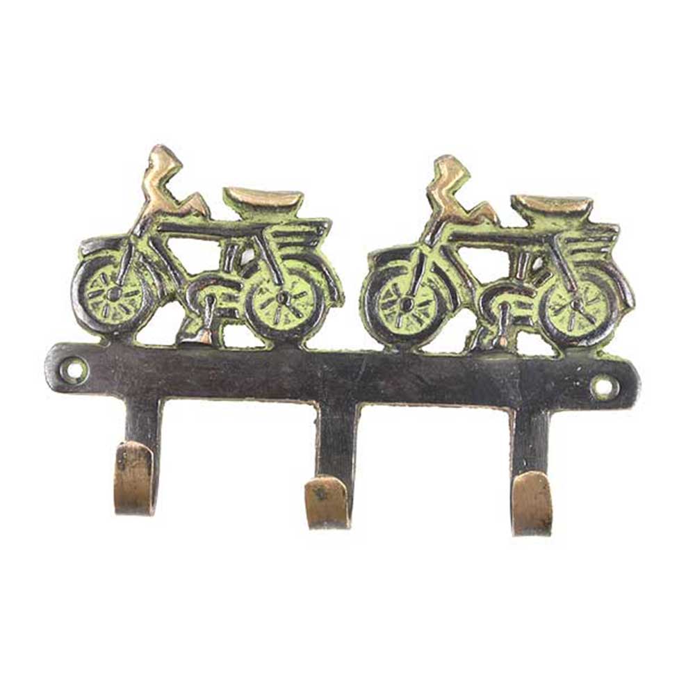 This is 3 Brass Bike Rack A Wonderful Collector Piece with three hooks. It has a beautiful patina and is exclusively hand crafted by expert artisans so that each hook so that no two look similar. It has two racers bicycle and three hooks to hang your coats, towels, napkin, belts bags etc.