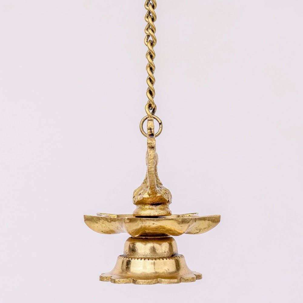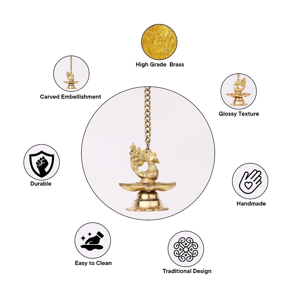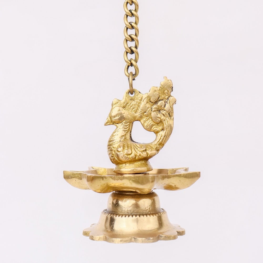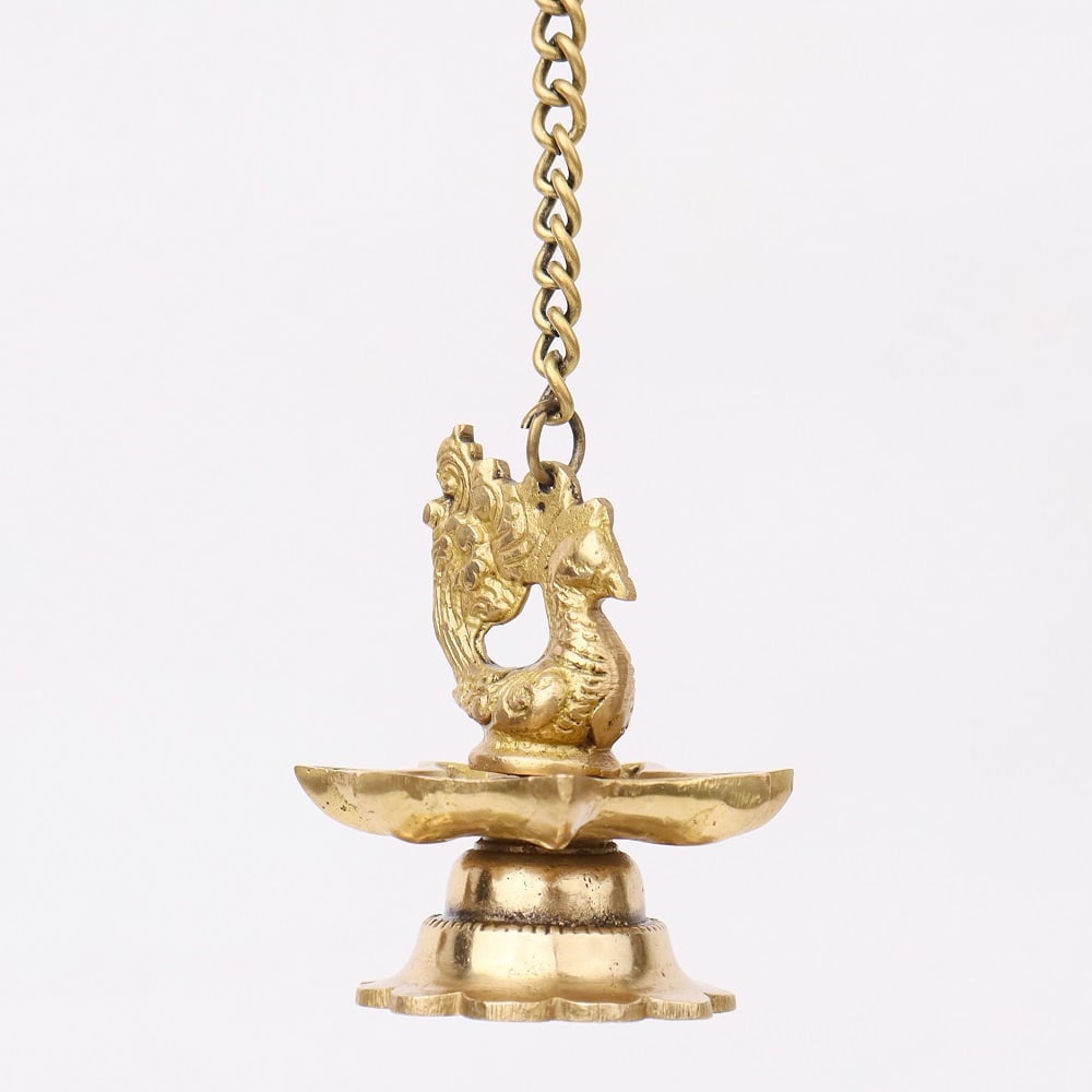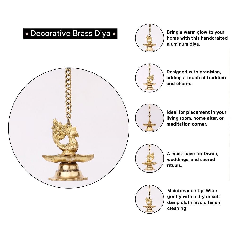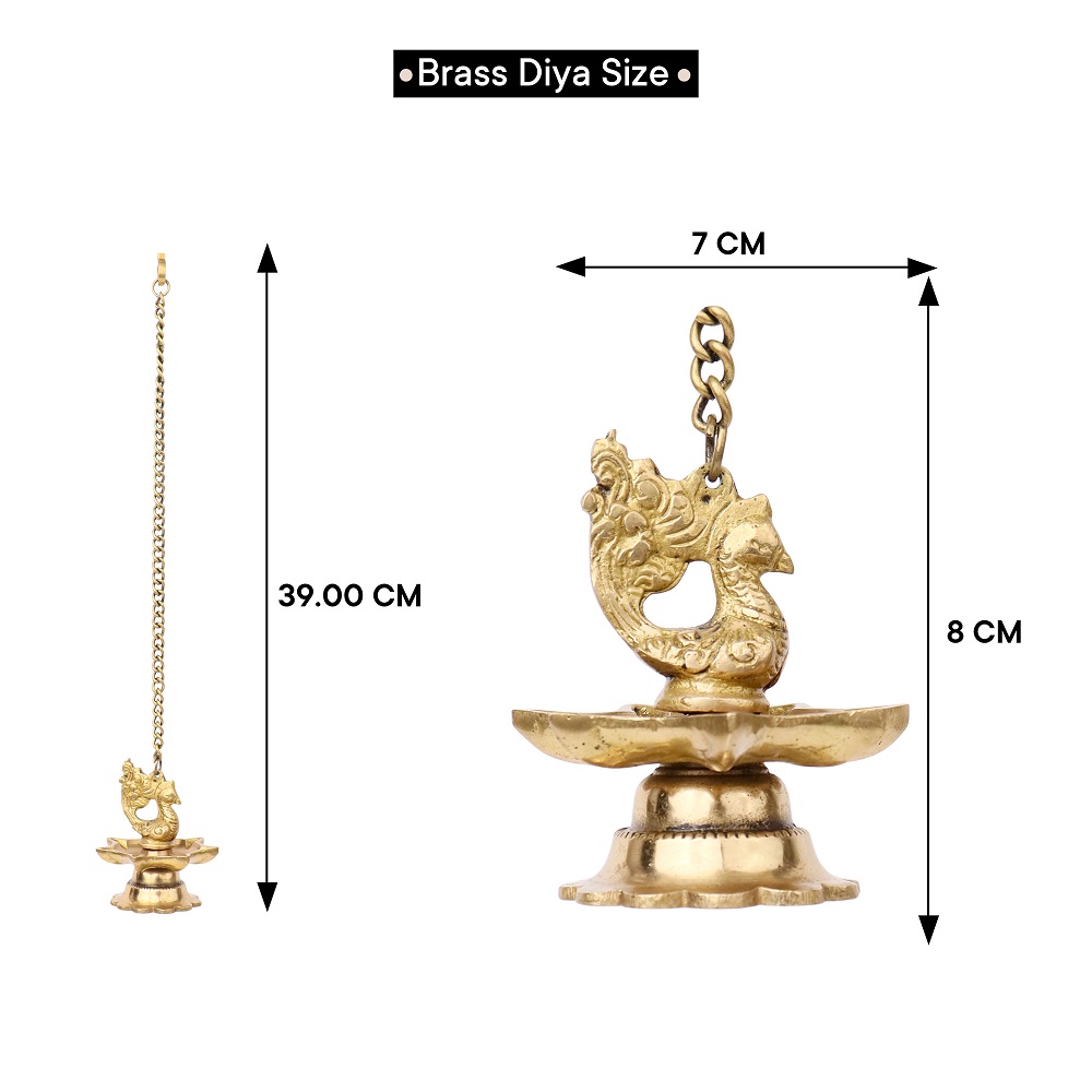 The intricate brass peacock design reflects the richness of Indian heritage, symbolizing beauty, grace, and prosperity. The seven wicks are strategically placed to enhance the light emitted, creating a captivating and harmonious glow. The hanging chain adds a layer of sophistication, making these diyas not only functional but also decorative pieces.