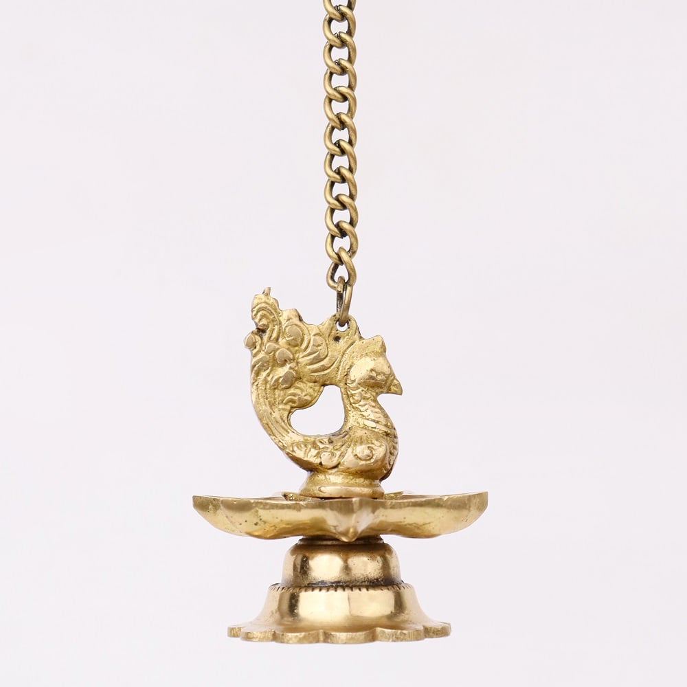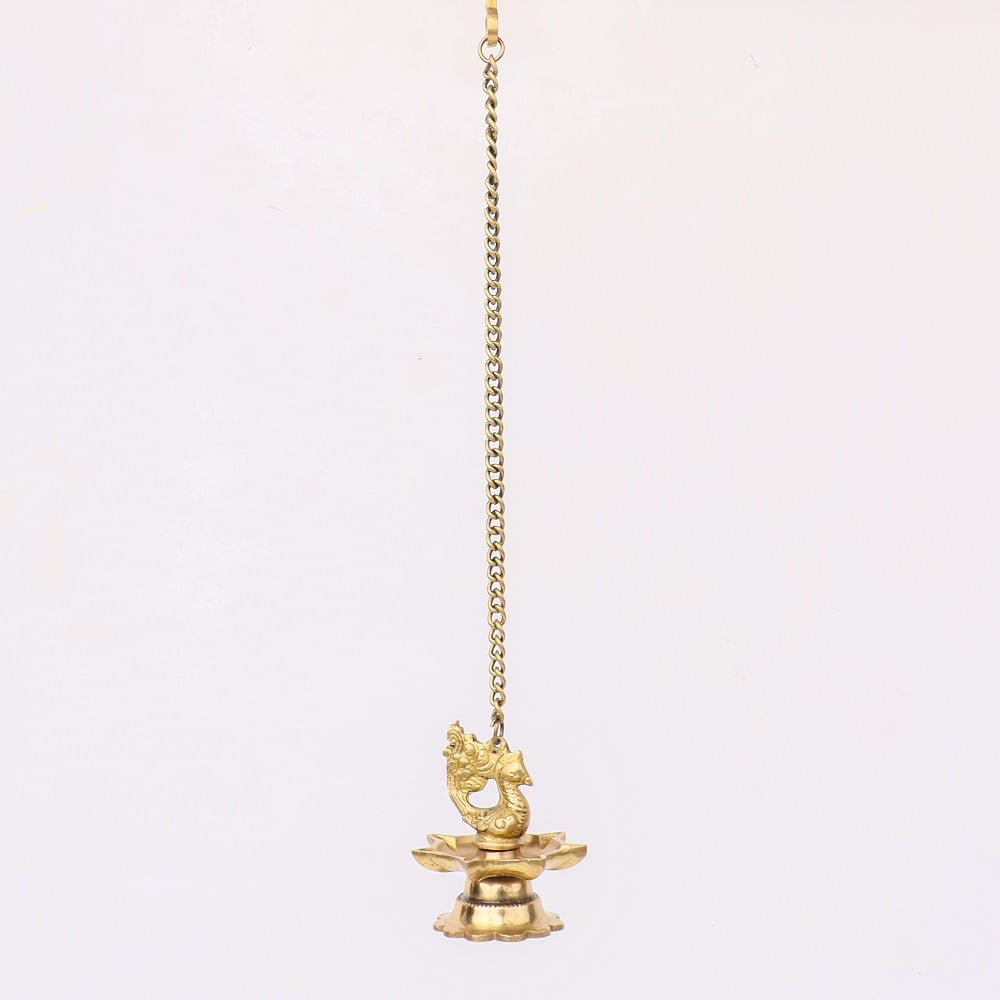Indianshelf.com for bulk/wholesale orders.Indianshelf.us for personal purchases.The Brass Peacock 7 Wick Hanging Chain Diya in Set of 2 is a magnificent lighting fixture that blends traditional craftsmanship with contemporary elegance. With seven wicks arranged in a beautiful peacock-inspired design, these diyas bring an aura of warmth, spirituality, and grandeur to any space. Perfect for illuminating your home during festivals, poojas, or any special occasion, these diyas create a mesmerizing display of light and beauty.