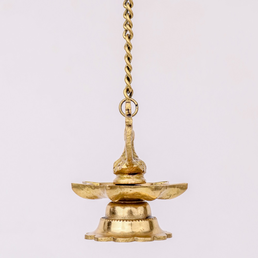 The intricate brass peacock design reflects the richness of Indian heritage, symbolizing beauty, grace, and prosperity. The seven wicks are strategically placed to enhance the light emitted, creating a captivating and harmonious glow. The hanging chain adds a layer of sophistication, making these diyas not only functional but also decorative pieces.