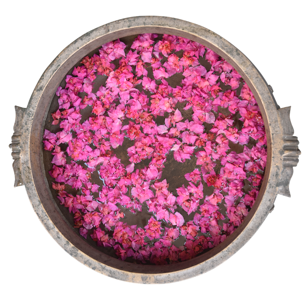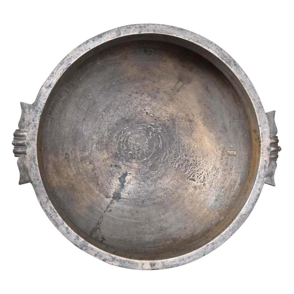 Bronze Urli Indian Style with Handle Having Beautiful Ornamentation. Ideal to Put Flowers and Floating Candles and Use It as a Perfect Indoor/Outdoor Decoration. It is Completely Done by Hand. It Serves as a Beautiful Bronze Bird Bath Too.