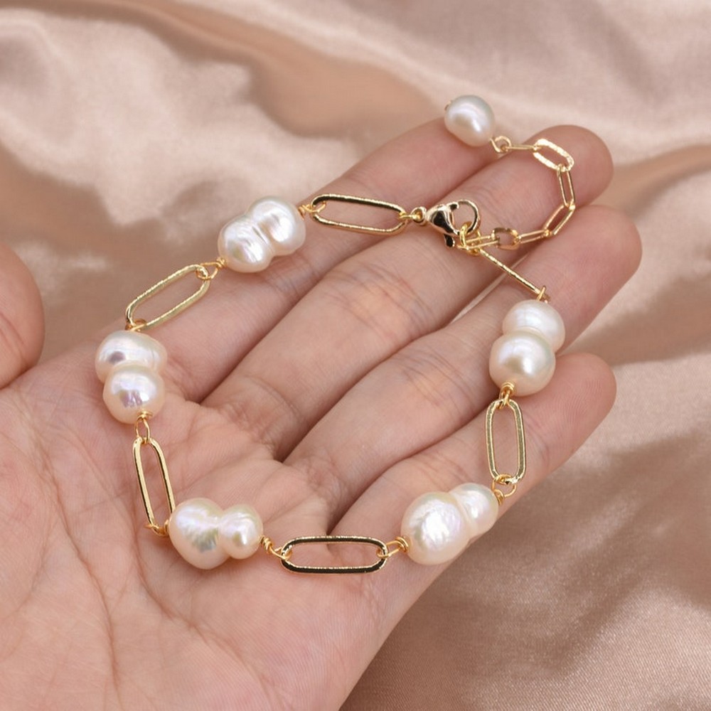 Organic, luminous, and exquisitely handcraftedthis 22K gold plated baroque pearl bracelet celebrates the natural beauty of irregular pearls paired with a modern chainlink design. Each pearl showcases unique curves and soft iridescence, creating an elegant statement piece that blends classic charm with contemporary style.