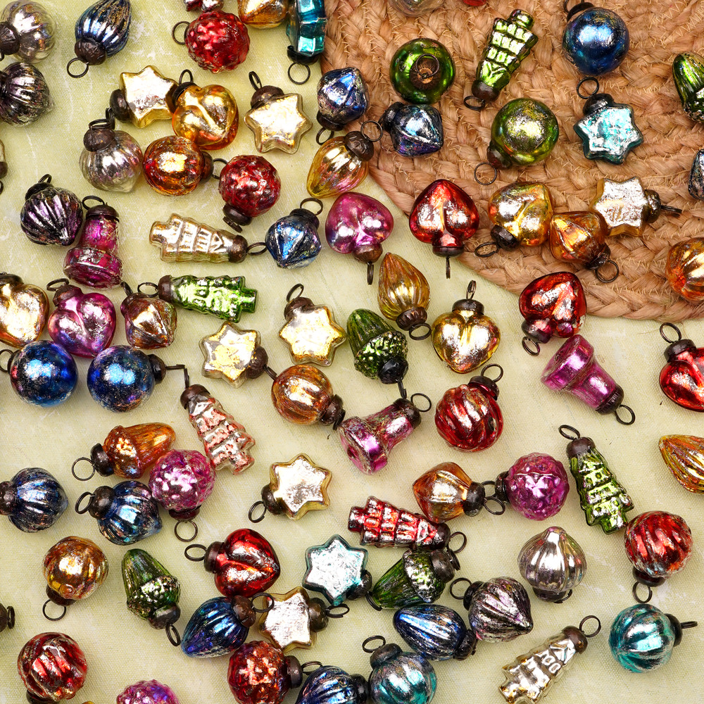 Add a touch of enchantment to your holiday celebrations with our exquisite set of 25 multi-coloured Distressed glass Christmas ornaments. Crafted with precision and care by skilled Indian artisans, these ornaments are a celebration of craftsmanship and tradition. Each ornament comes in a unique shape, adding variety and charm to your holiday decor. Hang them on your Christmas tree to create a dazzling display of colours and shapes, or use them to adorn your home and garden for a magical atmosphere during festive occasions. These handcrafted ornaments are versatile and can also be the perfect decorative addition to wedding ceremonies and bridal shower parties, infusing your special day with a burst of vibrant hues. What makes these ornaments truly special is their heartfelt craftsmanship, making them ideal gifts for your family, friends or relatives on special occasions or during festive seasons. Share the joy of handcrafted beauty with these glass Christmas ornaments that capture the essence of tradition, celebration, and the spirit of giving. Illuminate your holidays with the brilliance of Indian artistry and culture.