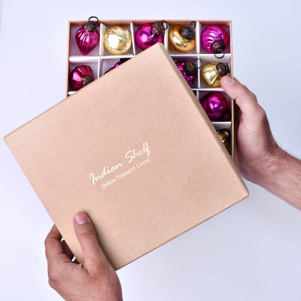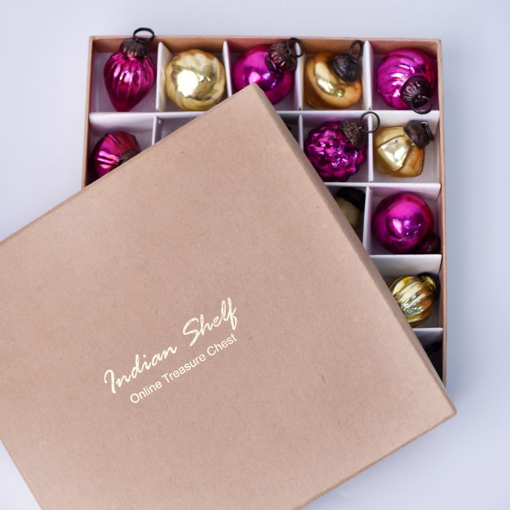 Enhance your festive decor with this exquisite set of 25 handmade glass Christmas ornaments in stunning Pink and golden hues. Crafted with precision and care by talented Indian artisans, these ornaments showcase a captivating array of shapes that will add a touch of elegance to any setting. Whether adorning your home, office, hotel, or shop, these ornaments are a versatile addition to your decor collection. Their vibrant colours and intricate designs make them perfect for enhancing the festive spirit during Christmas and other celebrations. Hang them on your tree, drape them along a mantelpiece, or use them to adorn wreaths and garlands for an enchanting display. These ornaments aren't just for your own enjoyment, they also make for thoughtful gifts on special occasions and festivals. Share the craftsmanship and festive joy with your loved ones by gifting them this set of glass ornaments. Each piece in this collection reflects the dedication of the artisans who have poured their skill and creativity into making these timeless decorations.