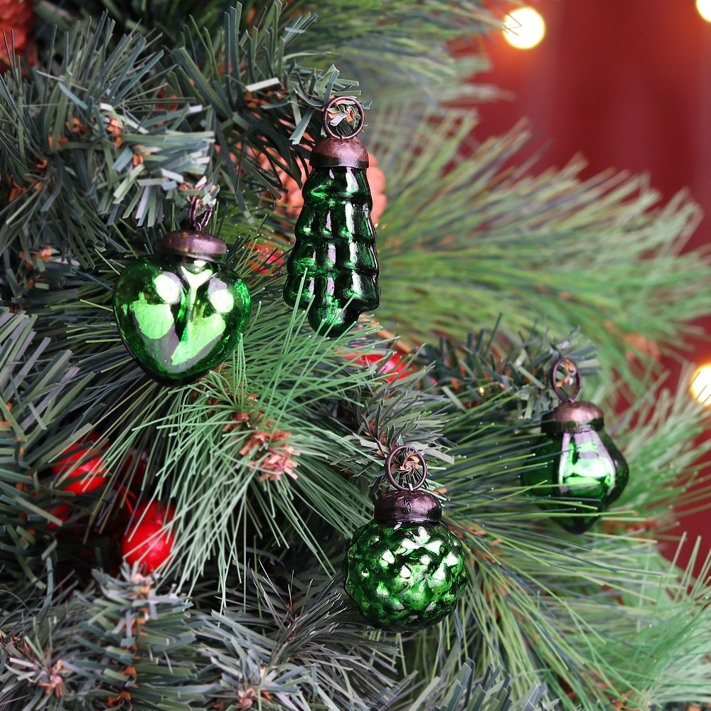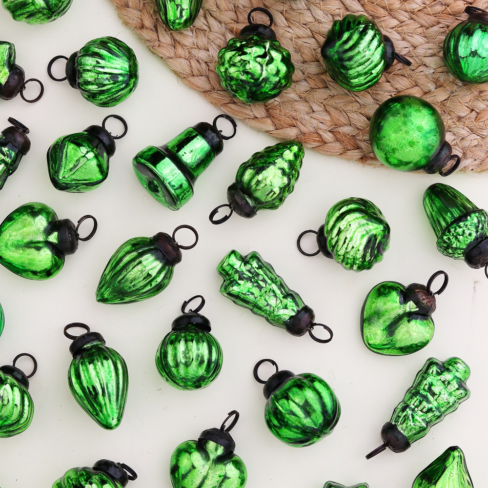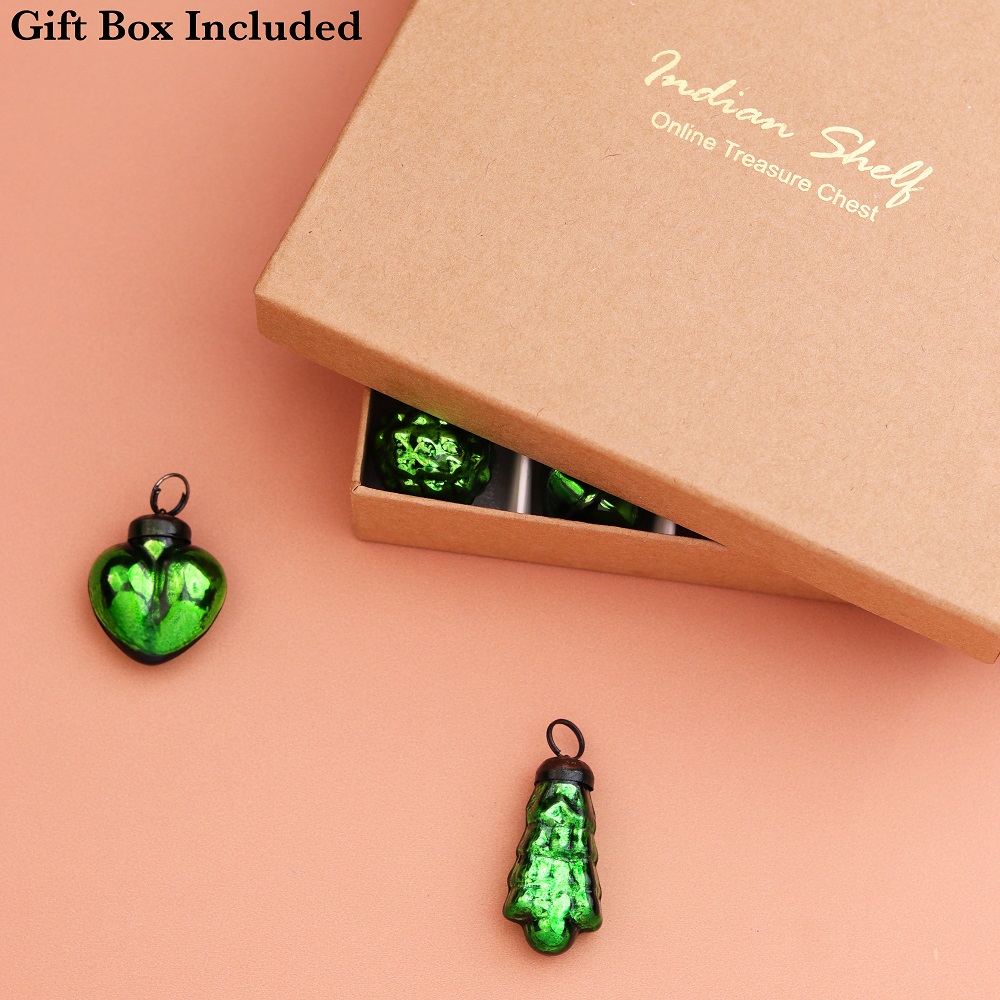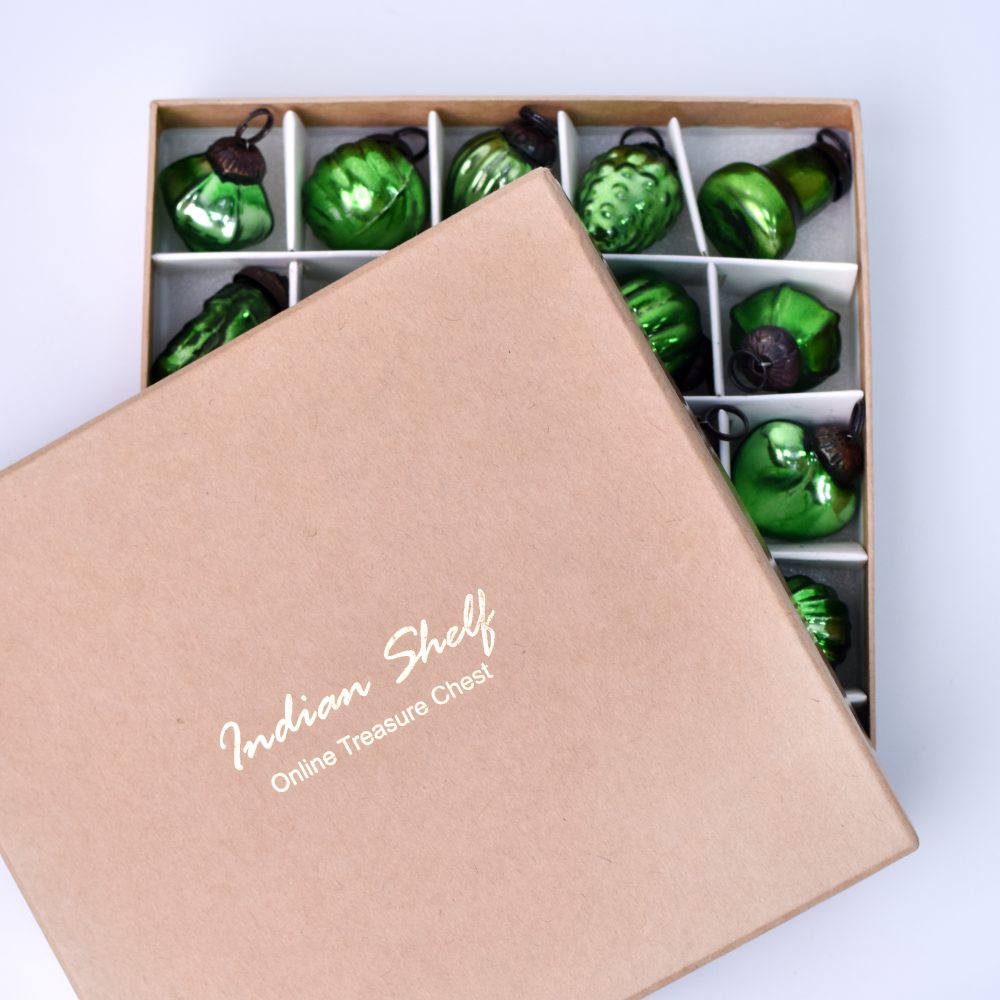 Enhance your festive celebrations with our exquisite set of 25 handmade glass Christmas ornaments in a stunning shade of green. Crafted with precision and love by skilled Indian artisans, each ornament is a testament to the artistry and craftsmanship passed down through generations. This enchanting collection features an array of unique shapes, adding a touch of whimsy and elegance to your holiday decor. Whether adorning your Christmas tree, gracing your wedding ceremony, embellishing a bridal shower party, or enhancing your home and garden decorations, these ornaments promise to infuse a sense of magic into any occasion. The vibrant green hue symbolizes life, renewal, and prosperity, making it an ideal choice for a wide range of festivities. Each ornament is meticulously crafted, ensuring durability and timeless beauty that will be cherished for years to come. Not only do these ornaments enhance your decor, but they also make for heartfelt gifts for your loved ones on special or festive occasions. Share the joy of the season with these handcrafted treasures that capture the spirit of celebration and togetherness.