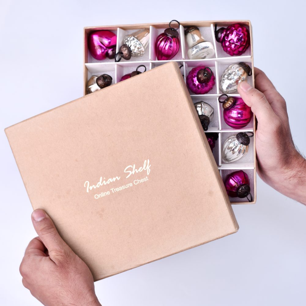 This set of 25 Glass Christmas Ornaments is meticulously crafted in enchanting pink and silver hues. Each ornament is a unique masterpiece, handcrafted with precision and care by highly skilled Indian artisans, adding a touch of tradition and artistry to your celebrations. This versatile set offers an array of shapes, ensuring a diverse and captivating display. The ornaments effortlessly transition from Christmas tree adornments to year-round decor, making them suitable for home, office, hotel, or shop decoration. Their shimmering magenta and silver tones add a touch of opulence and sophistication to any space. These ornaments are not limited to Christmas alone, they can also enhance the ambiance of your home during various festivals and special occasions. Whether adorning your holiday tree, creating a captivating centerpiece, or adding charm to your living spaces, these ornaments are designed to delight. Share the joy of the season with your loved ones by gifting them these handmade treasures. Their timeless beauty and craftsmanship make them a thoughtful and memorable present for any special or festive occasion.