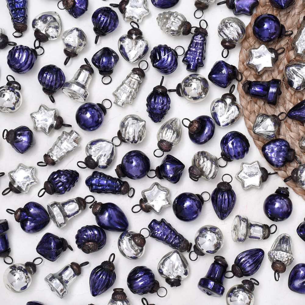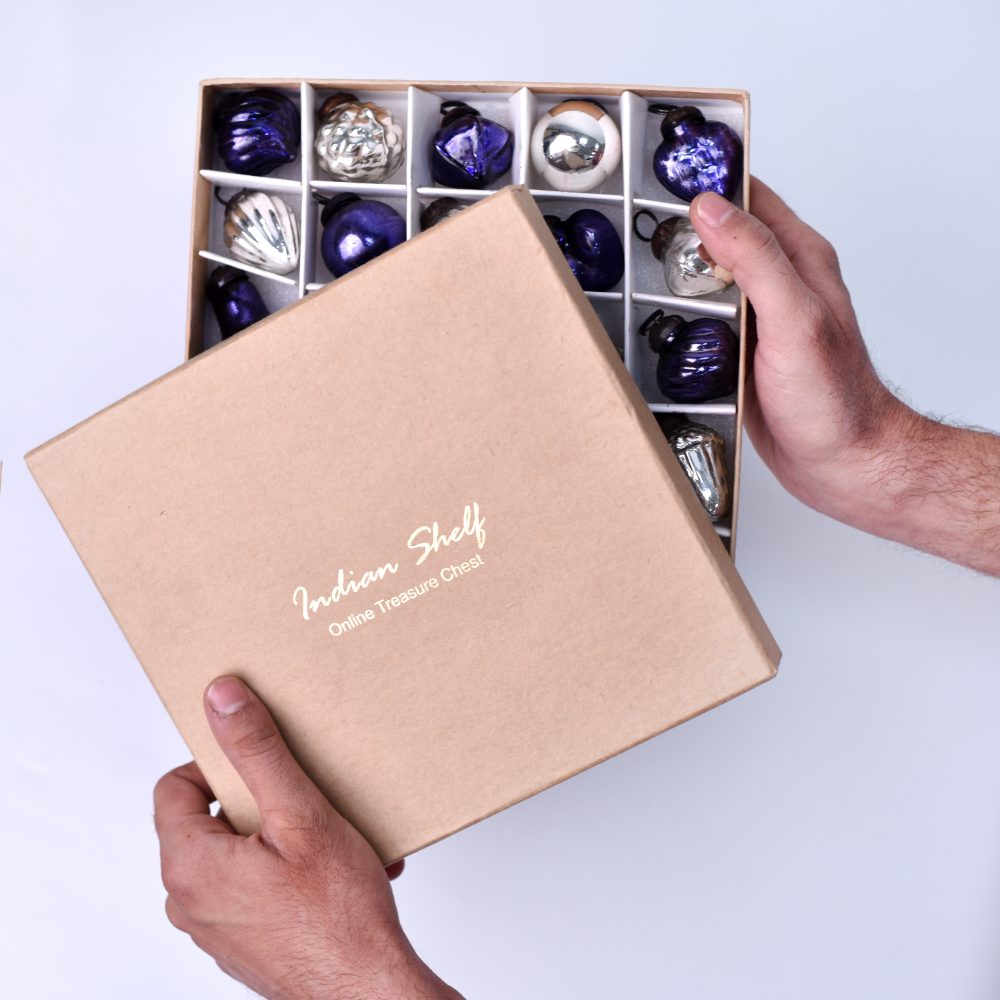 Add a touch of elegance and tradition to your holiday decor with this exquisite set of 25 handmade glass Christmas ornaments. Crafted with care by highly talented Indian artisans, each ornament is a testament to their craftsmanship and attention to detail. The set features a stunning combination of purple and silver hues, adding a regal and festive flair to any setting. These ornaments come in a variety of charming shapes, ensuring a delightful mix for your decorating needs. Whether adorning your home, office, hotel, or shop, these ornaments create a magical atmosphere during Christmas, house decorations, and various festivals. Hang them on your tree, wreaths, garlands, or even use them as table centerpieces for a shimmering holiday display. Not only are these ornaments perfect for your own celebrations, but they also make for thoughtful gifts on special occasions or during the festive season.