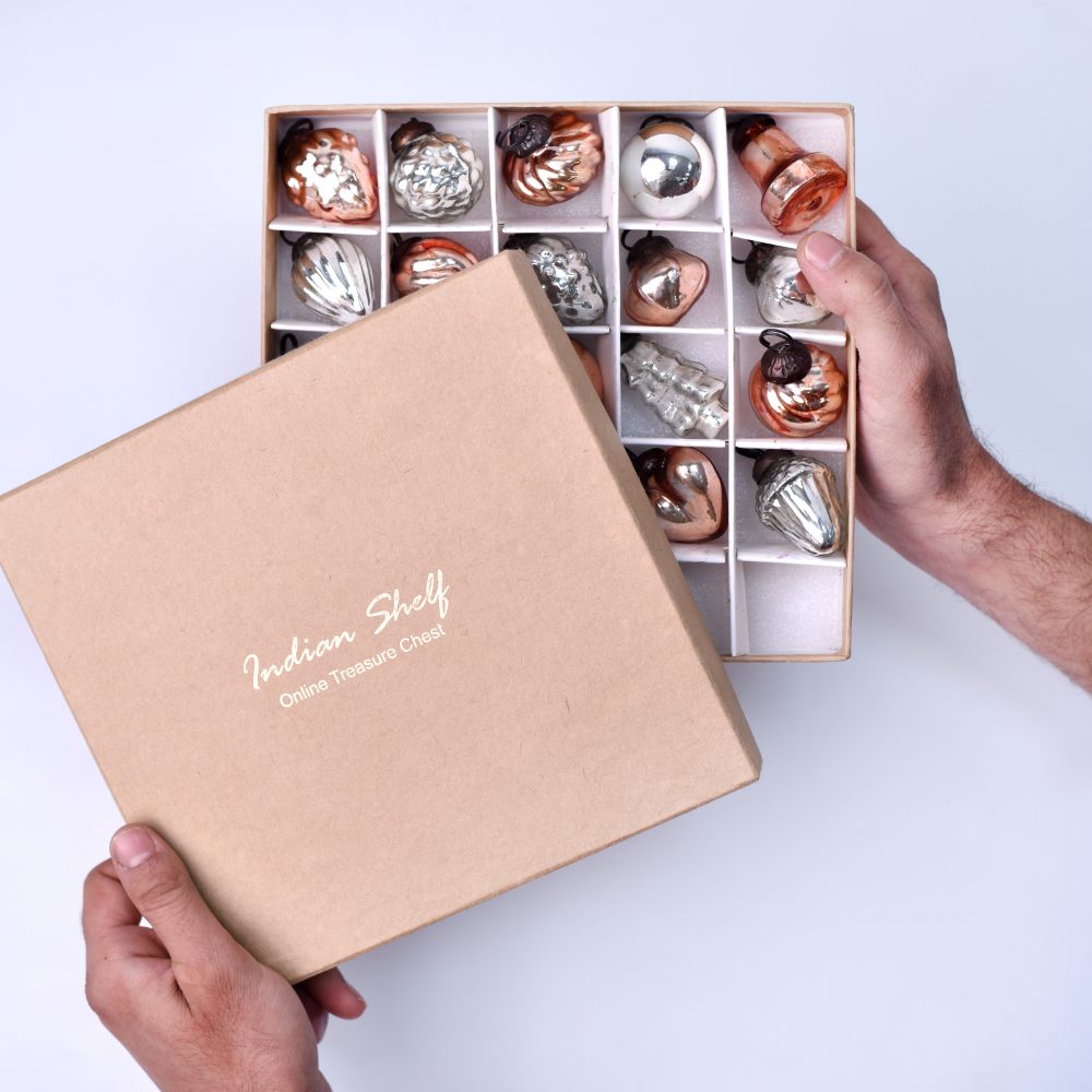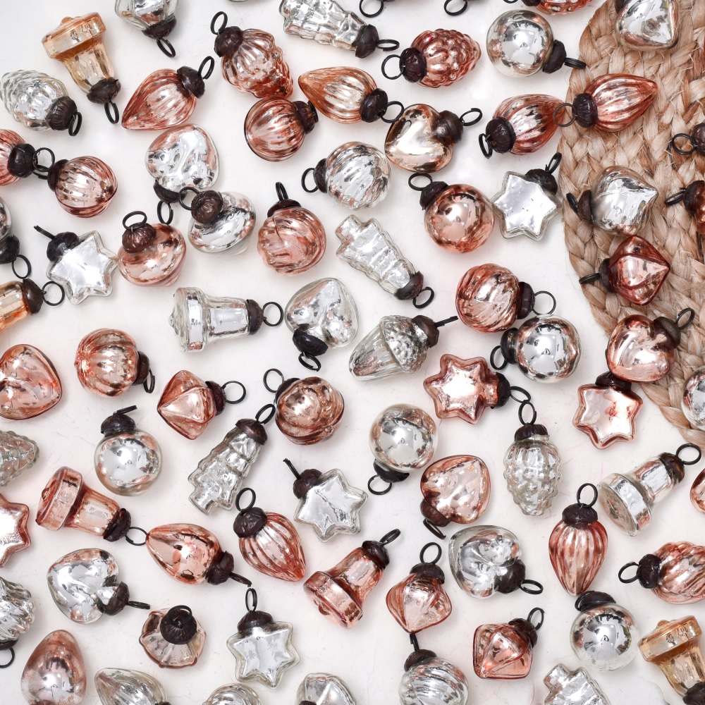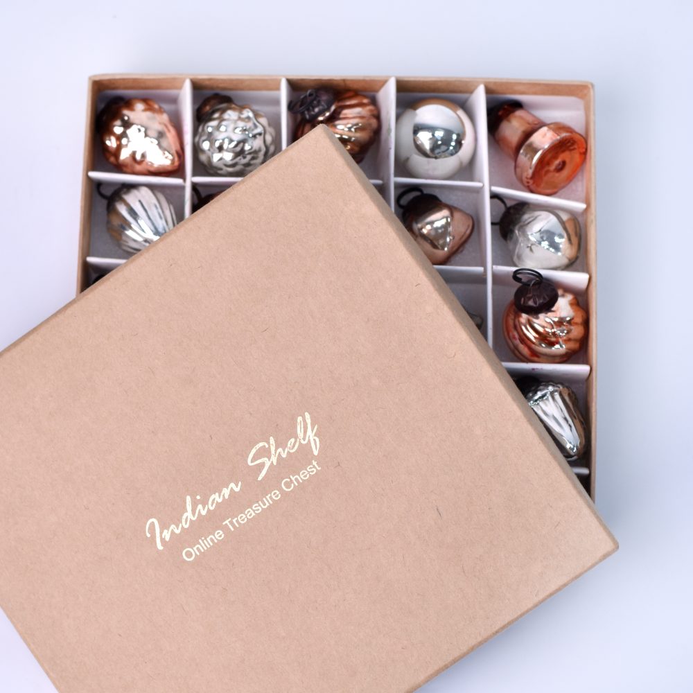This set of 25 glass Christmas ornaments is beautifully crafted in the enchanting hues of rose gold and silver. Each piece is meticulously handcrafted by skilled Indian artisans, ensuring a unique and artisanal touch to your festivities. This ornament set offers an array of charming shapes and designs, adding a touch of elegance and sophistication to your Christmas tree or any festive setting. The delicate blend of rose gold and silver adds a touch of opulence to your home, office, hotel, or shop decorations. These ornaments are not limited to Christmas alone, they are versatile enough to adorn your space during various festivals and celebrations. Their timeless appeal makes them a perfect addition to housewarming parties, weddings, or other special occasions. With their fine craftsmanship and attention to detail, these ornaments make for a thoughtful and cherished gift for your loved ones. Share the joy of the season by gifting them these exquisite decorations that capture the essence of Indian artistry and the spirit of celebration.