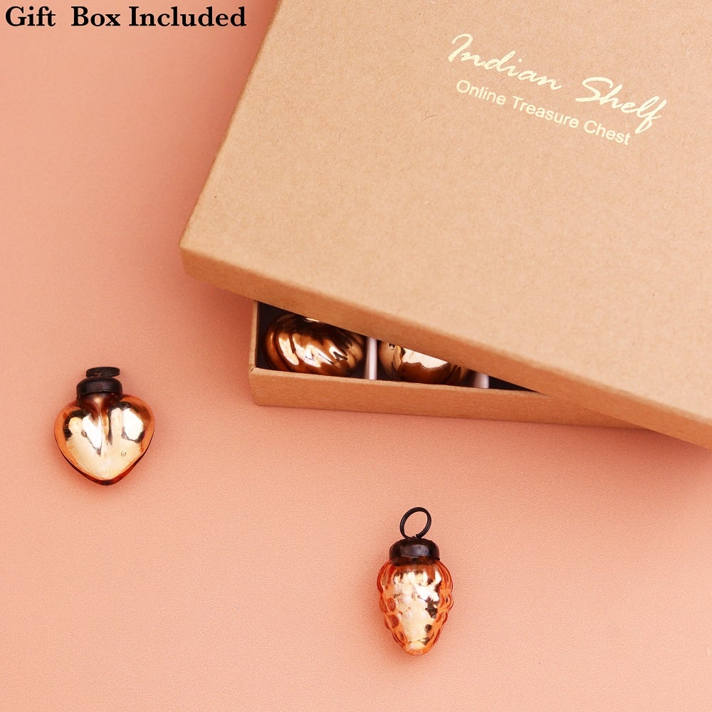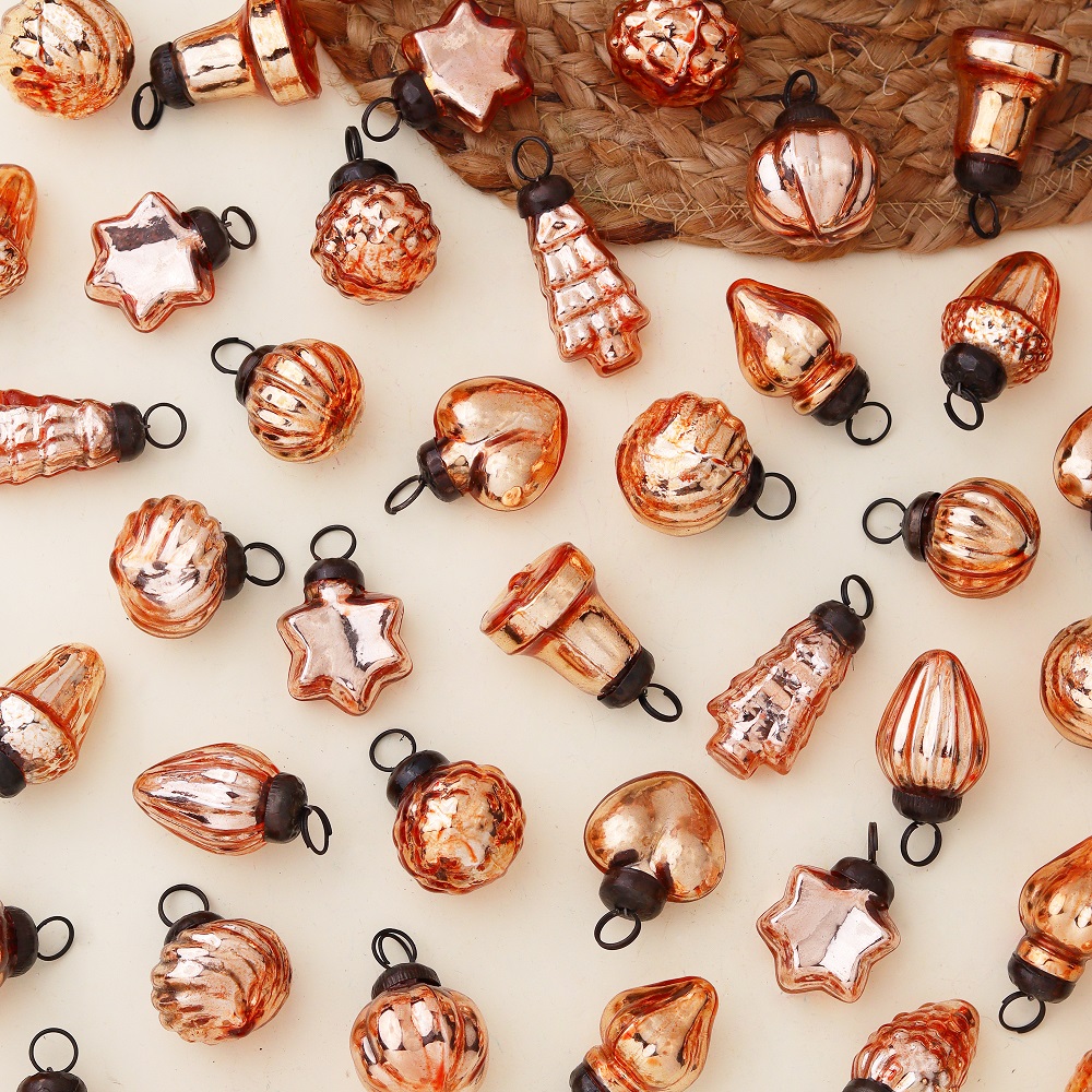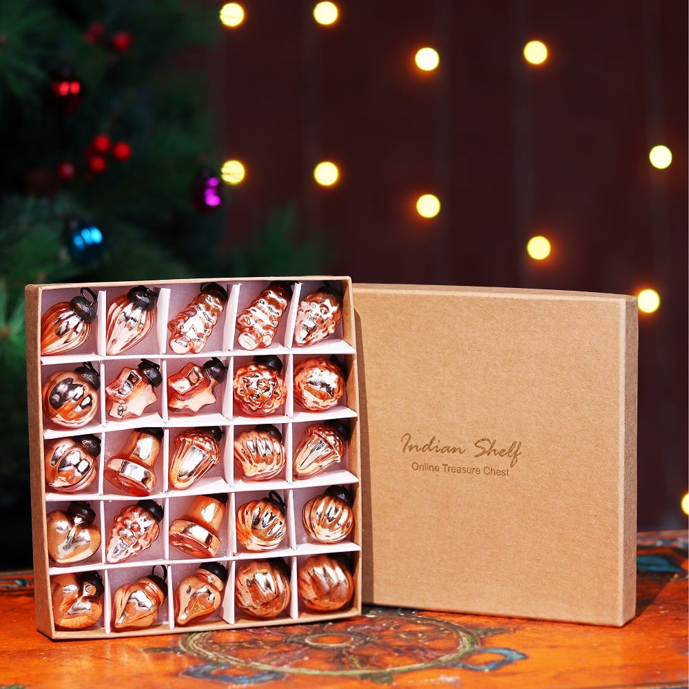 Buy a set of 25 handmade glass Christmas ornaments in stunning rose gold and get a hassle free delivery at your doorstep. Crafted with precision and care by talented Indian artisans, each ornament is a masterpiece of craftsmanship and design. This set features an array of enchanting shapes, from classic spheres to charming snowflakes and intricate bells. The rose gold hue adds a touch of opulence and warmth to any space, making it ideal for home, office, hotel, or shop decorations. During Christmas, these ornaments create a magical ambiance, whether adorning your tree, wreath, or mantel. However, their versatility extends beyond the holiday season, they can enhance your decor during various festivals throughout the year. Looking for a thoughtful gift? These ornaments make for a cherished present for your loved ones on special occasions, adding a touch of elegance to their celebrations.