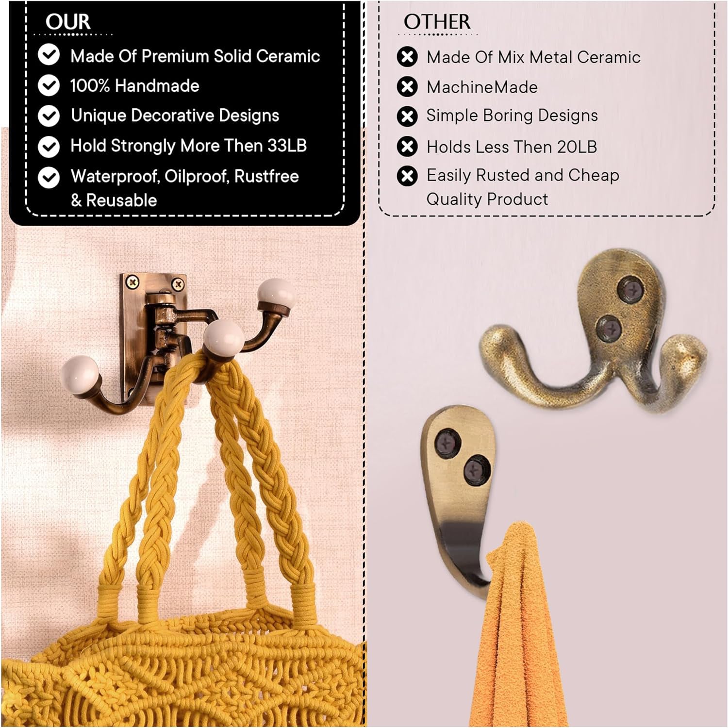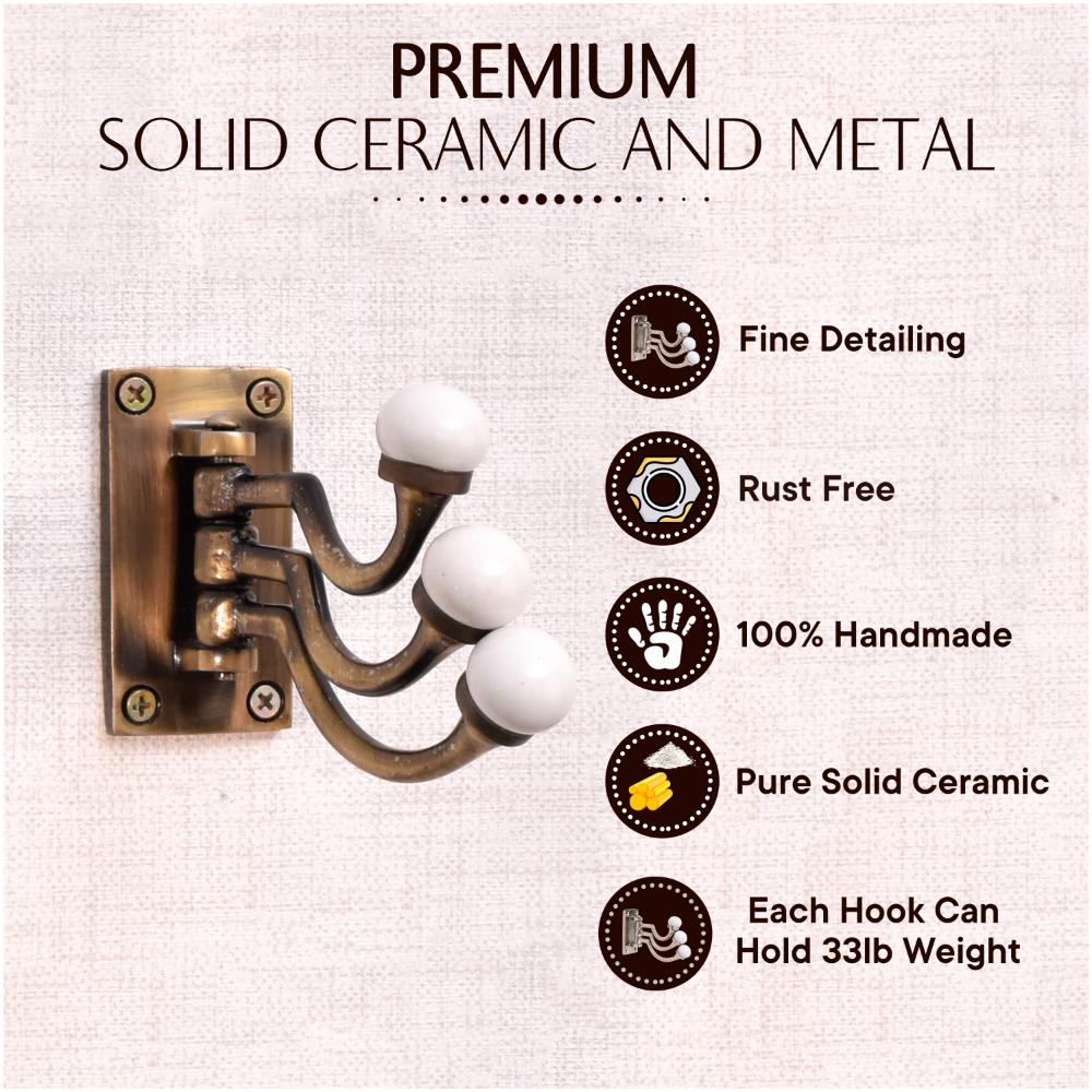 Made from sturdy metal and high-quality ceramic, these hooks are built to last. The metal base is rust-resistant, ensuring longevity and durability even in high-humidity areas like bathrooms. The ceramic knobs, while stylish, are also designed for heavy-duty use, so you can rely on these hooks to hold your items securely for years.