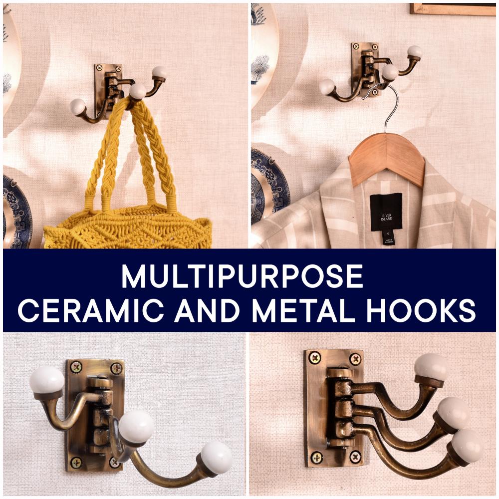 Crafted with a rustic antique metal base, each hook is complemented by a smooth ceramic knob that is glazed to perfection. The intricate detailing on the metal gives it an old-world charm, while the ceramic adds a clean, fresh element to the design. Together, they form a harmonious fusion of materials that is both striking and highly functional. This wall hook set will make a statement in any room, combining vintage aesthetics with modern convenience.
