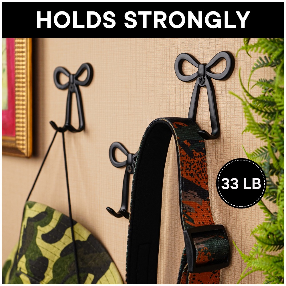 Add charm and functionality to your space with this stylish pack of 3 decorative wall hooks. Crafted from durable black aluminium, each hook features a unique bow-shaped design that brings a touch of elegance to any room. Ideal for hanging keys, handbags, accessories, or light items, these hooks are perfect for your entryway, bedroom, or closet. Easy to install and designed to complement modern or classic décor styles.