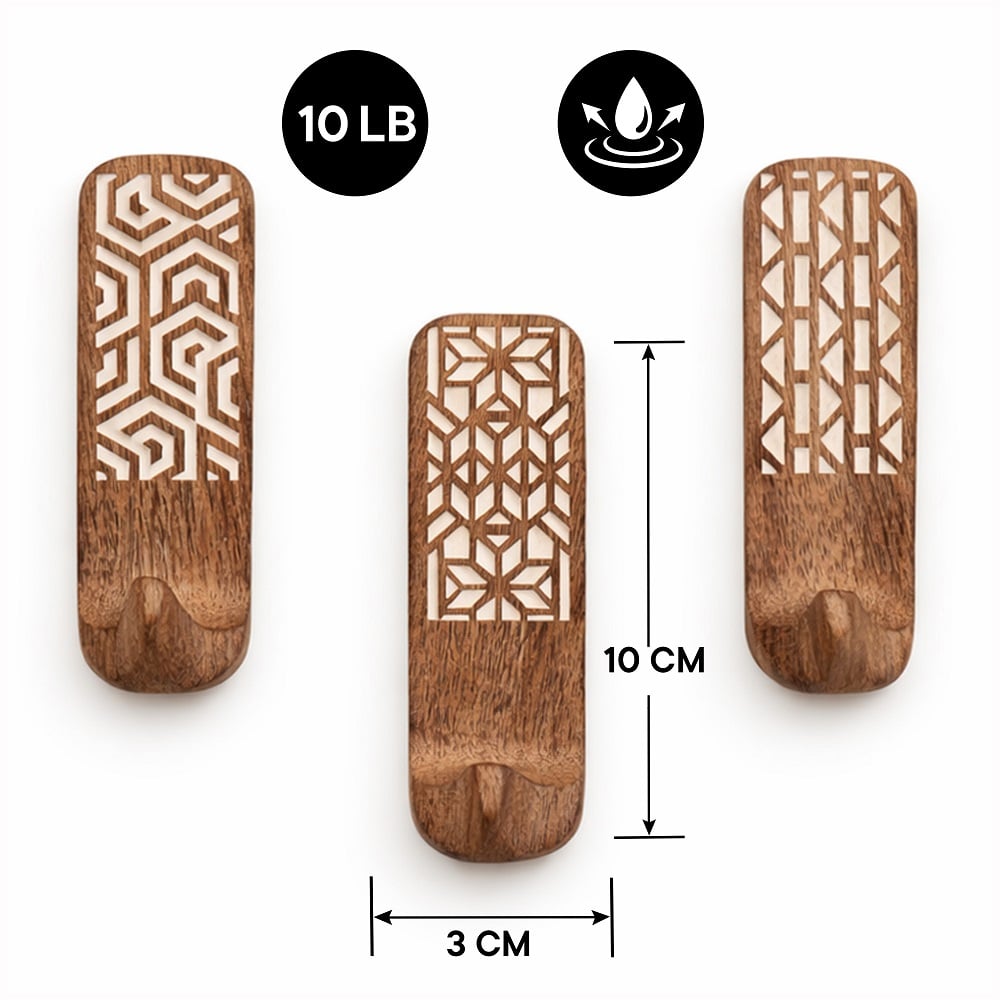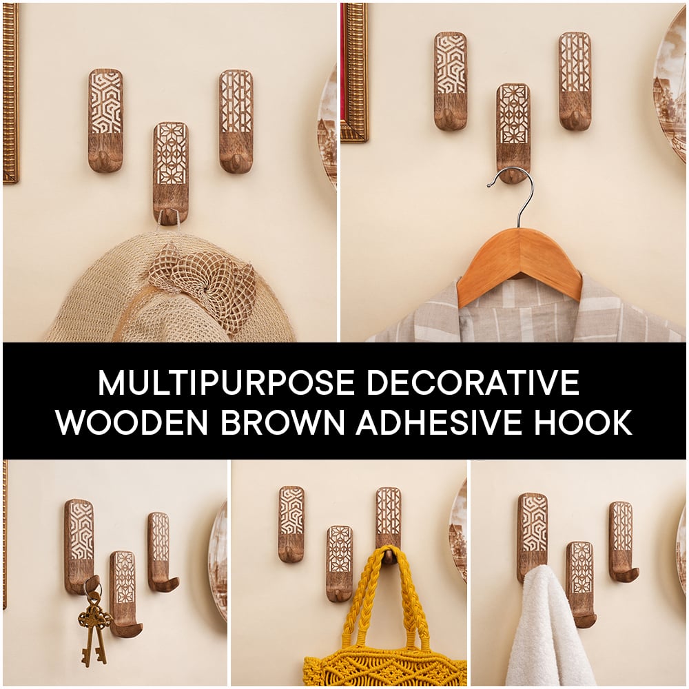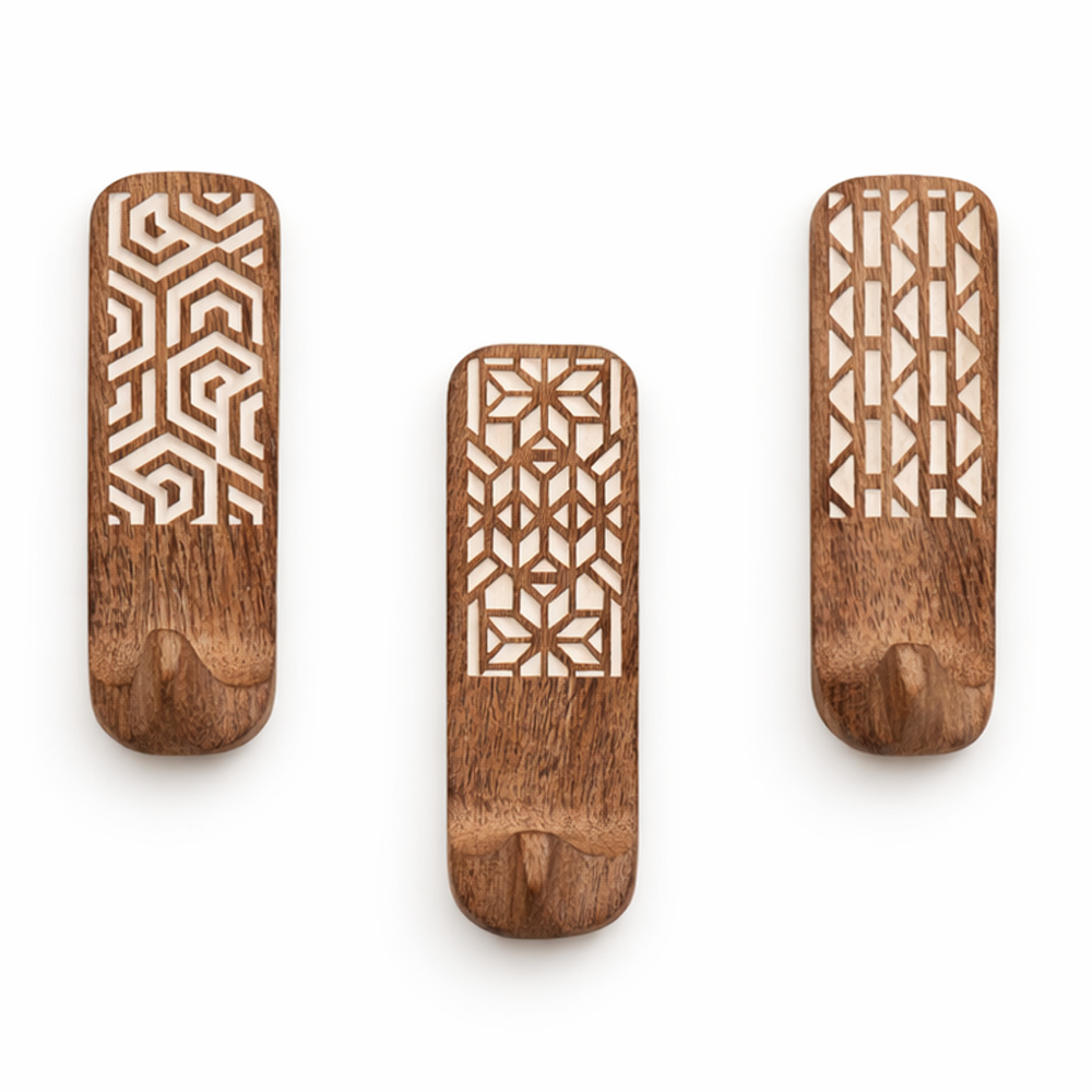 Upgrade your wall organization with this Designer Wooden Adhesive Wall Hook, crafted from premium natural wood and detailed with elegant geometric carvings. Featuring unique circular, spiral, and floral-inspired patterns, this hook adds a stylish decorative accent while offering practical storage for everyday essentials. The strong self-adhesive backing ensures quick, drill-free installationsimply peel and stick onto smooth surfaces like tiles, glass, metal, or finished wood. Its compact yet sturdy design makes it suitable for hanging towels, keys, clothes, scarves, caps, or lightweight bags. Perfect for bathrooms, bedrooms, entryways, kitchens, and offices, this wooden wall hook blends durability with aesthetic charm, keeping your space organized and visually appealing.