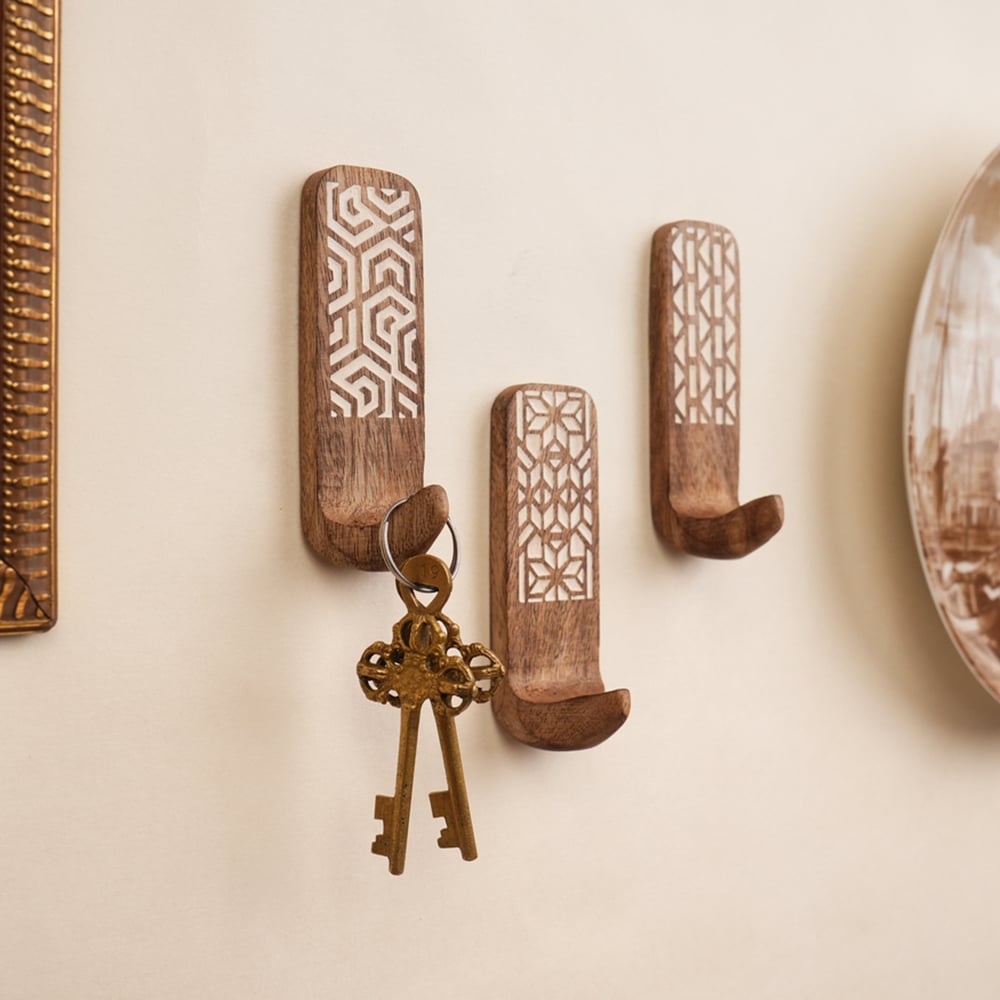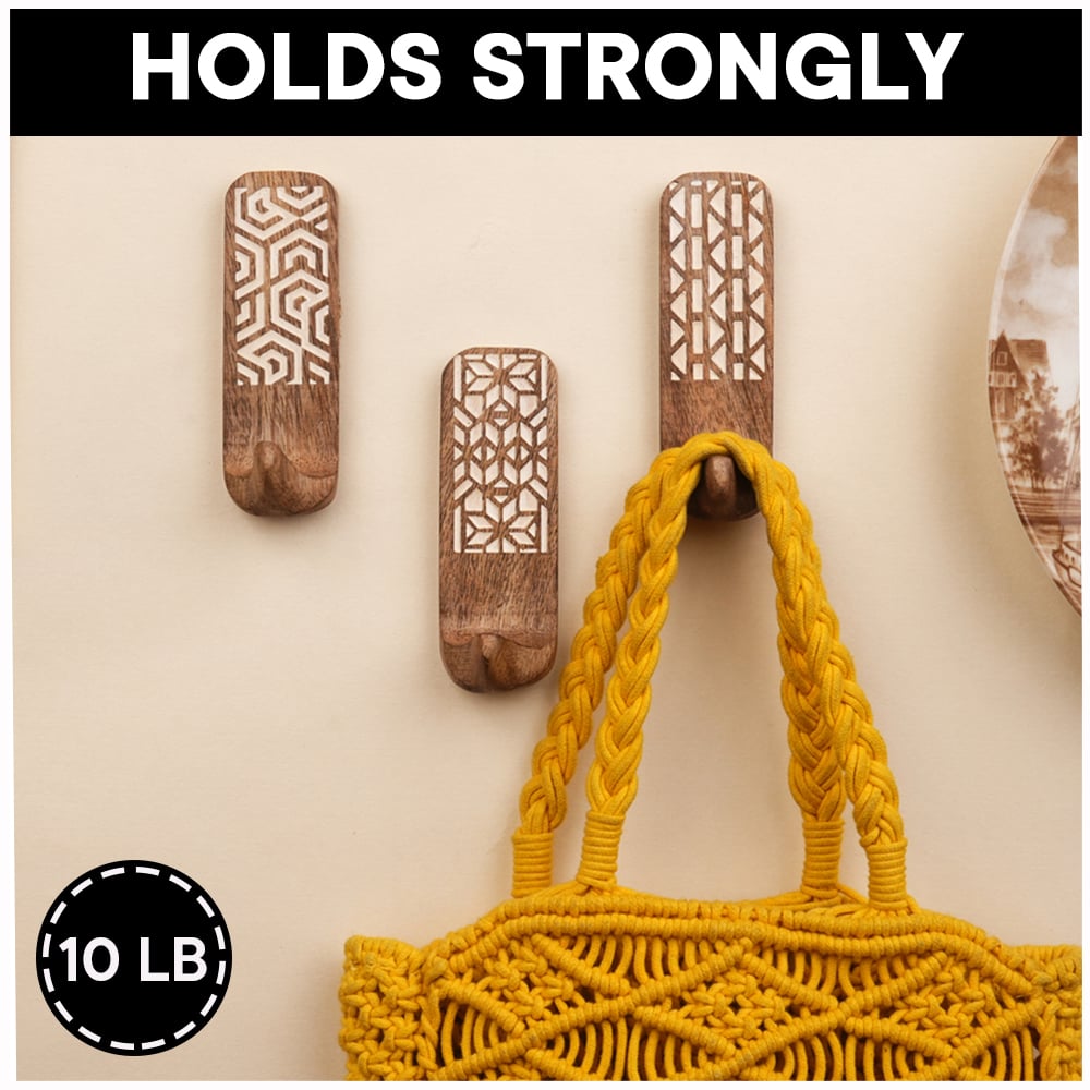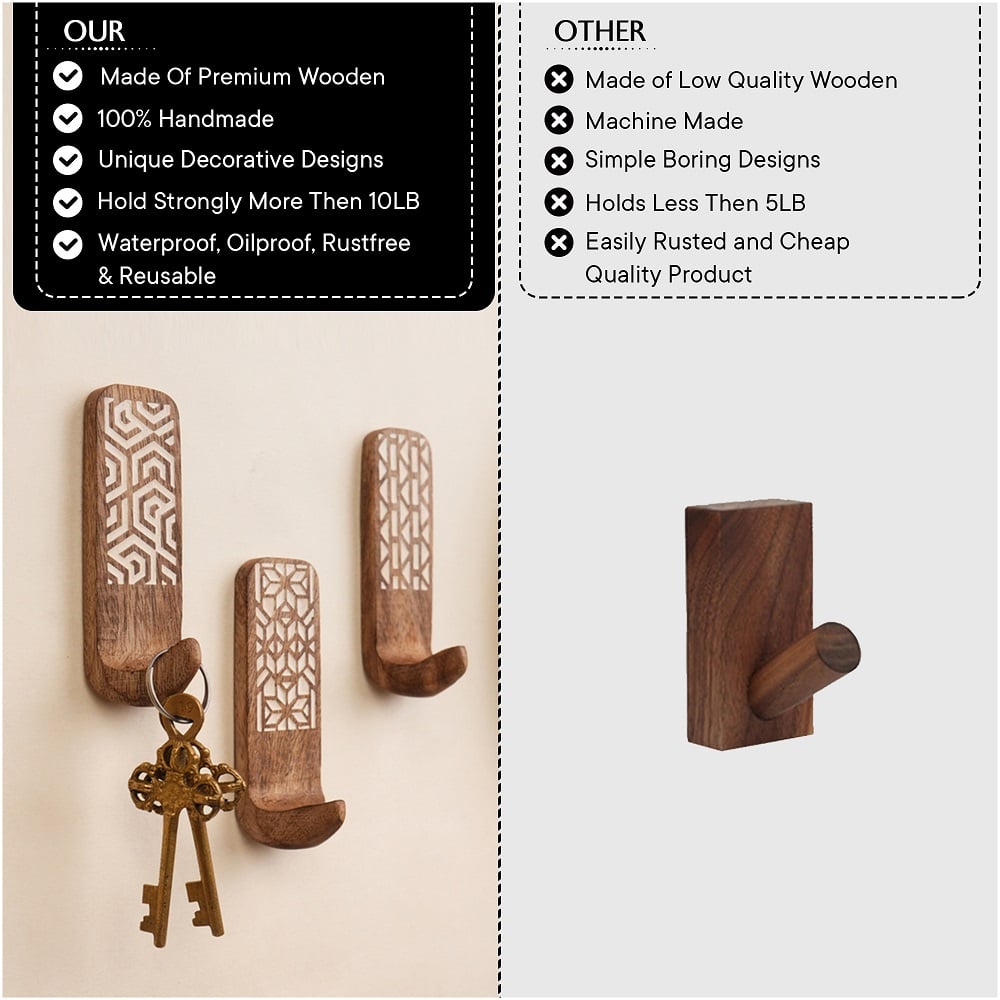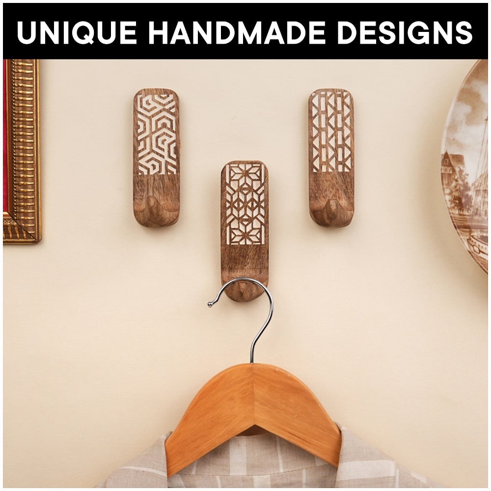 Upgrade your wall organization with this Designer Wooden Adhesive Wall Hook, crafted from premium natural wood and detailed with elegant geometric carvings. Featuring unique circular, spiral, and floral-inspired patterns, this hook adds a stylish decorative accent while offering practical storage for everyday essentials. The strong self-adhesive backing ensures quick, drill-free installationsimply peel and stick onto smooth surfaces like tiles, glass, metal, or finished wood. Its compact yet sturdy design makes it suitable for hanging towels, keys, clothes, scarves, caps, or lightweight bags. Perfect for bathrooms, bedrooms, entryways, kitchens, and offices, this wooden wall hook blends durability with aesthetic charm, keeping your space organized and visually appealing.