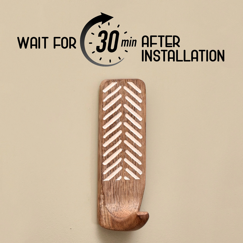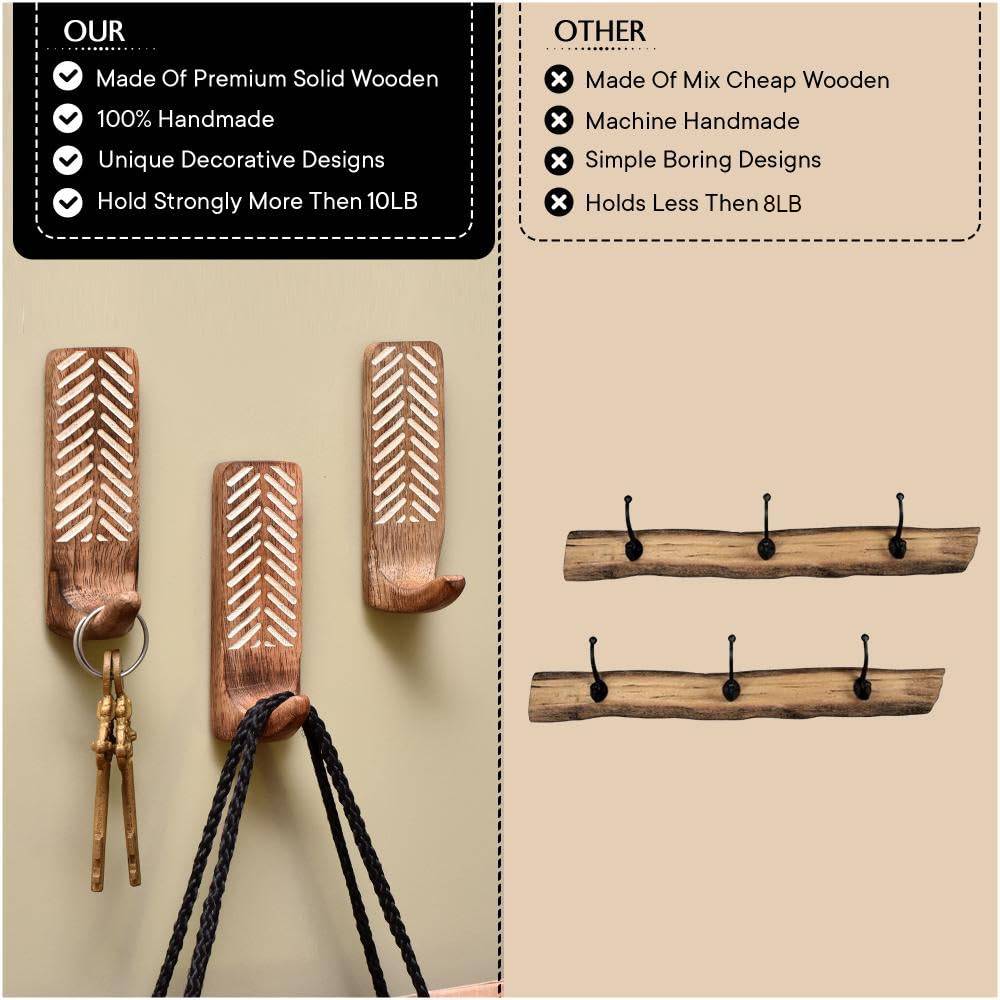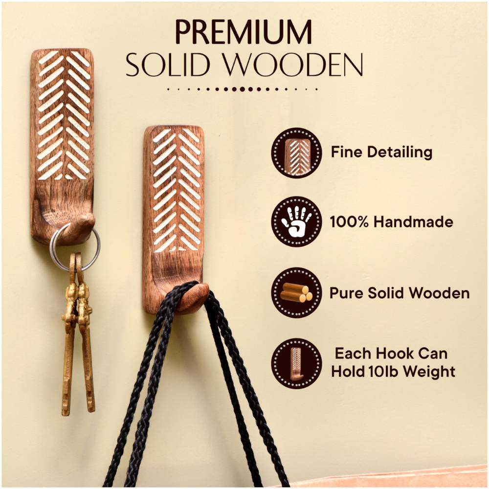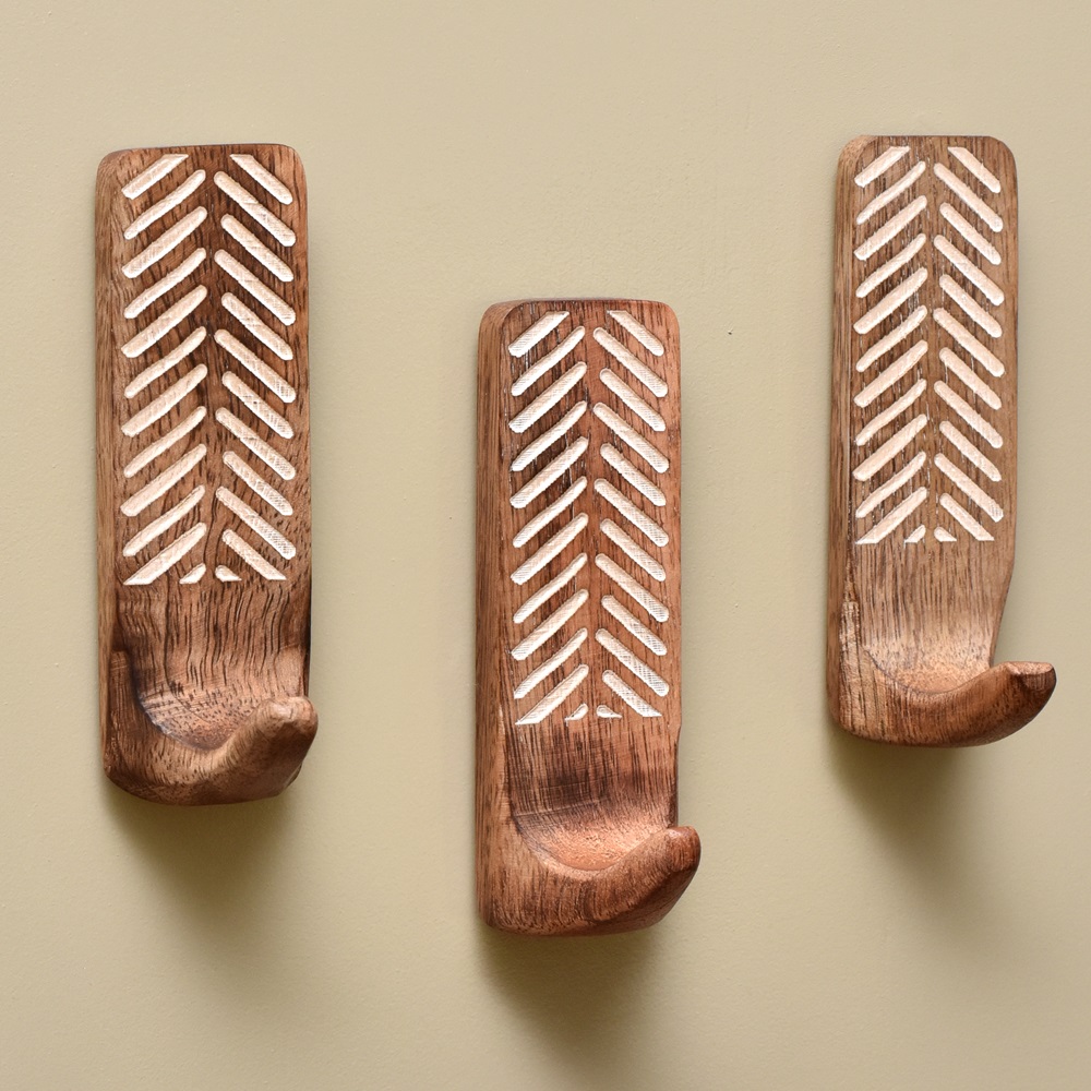 Buy a set of 3 brown wooden wall hooks that are adorned with a tasteful white colour pattern meticulously engraved by highly skilled Indian artisans. Handcrafted with precision from high-quality wood, these hooks seamlessly blend functionality with aesthetics, making them an ideal addition to any space. These hooks are more than just decorative pieces; they serve a practical purpose as versatile organizers. The set comes with heavy-duty adhesive hooks, ensuring easy and secure installation without the need for drills or tools. The self-adhesive hooks offer a hassle-free experience, allowing you to transform your living space effortlessly. Designed with practicality in mind, these adhesive towel hooks are perfect for hanging towels, clothes, hats, bags, keys, scarves, and jackets. Their sturdy construction ensures durability, making them reliable companions for your daily organizational needs. Elevate your home decor while maintaining a tidy living space with these functional yet stylish wall hooks. What sets these hooks apart is not just their utility but also their thoughtful craftsmanship, making them an ideal gift for your loved ones on special or festive occasions. Give the gift of organization and aesthetics with these handmade wall hooks, bringing a touch of artisanal charm to any home.