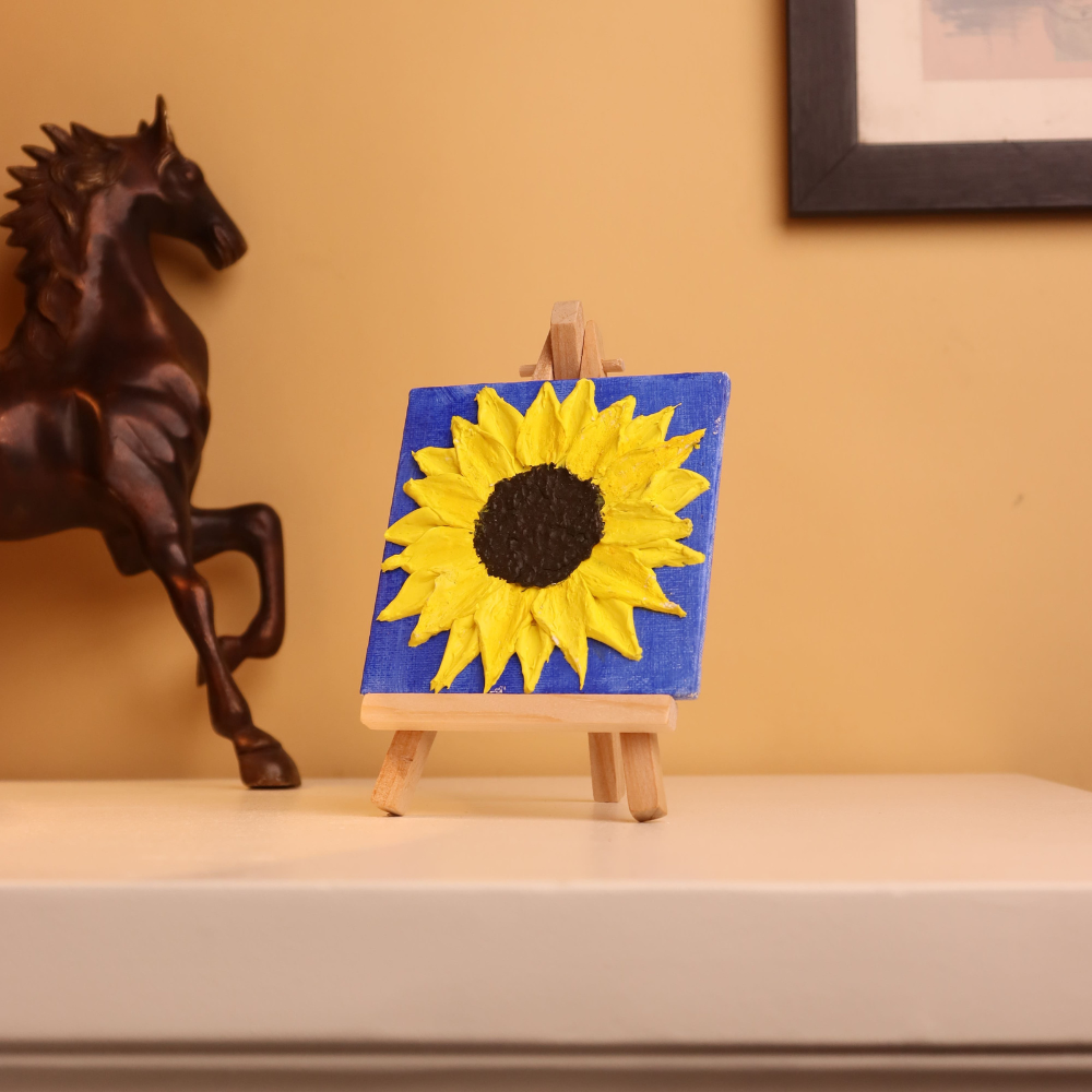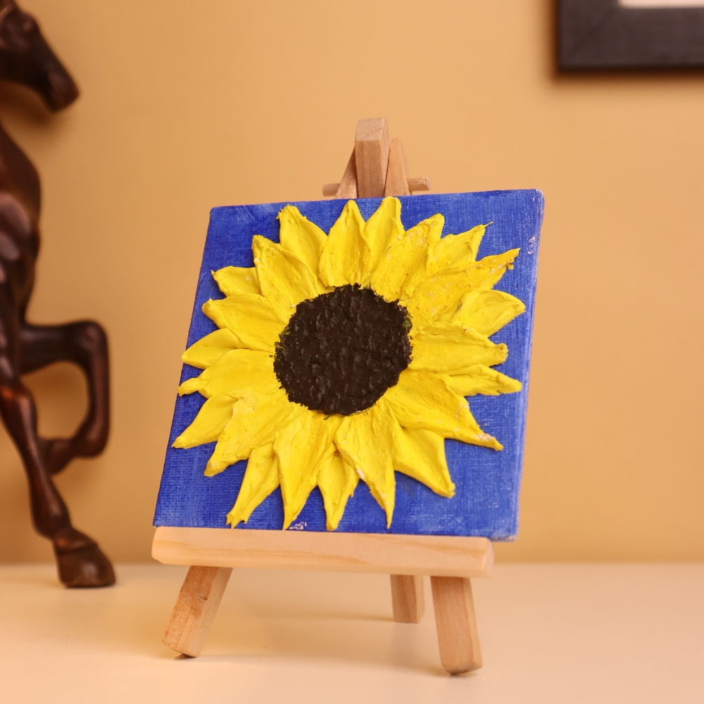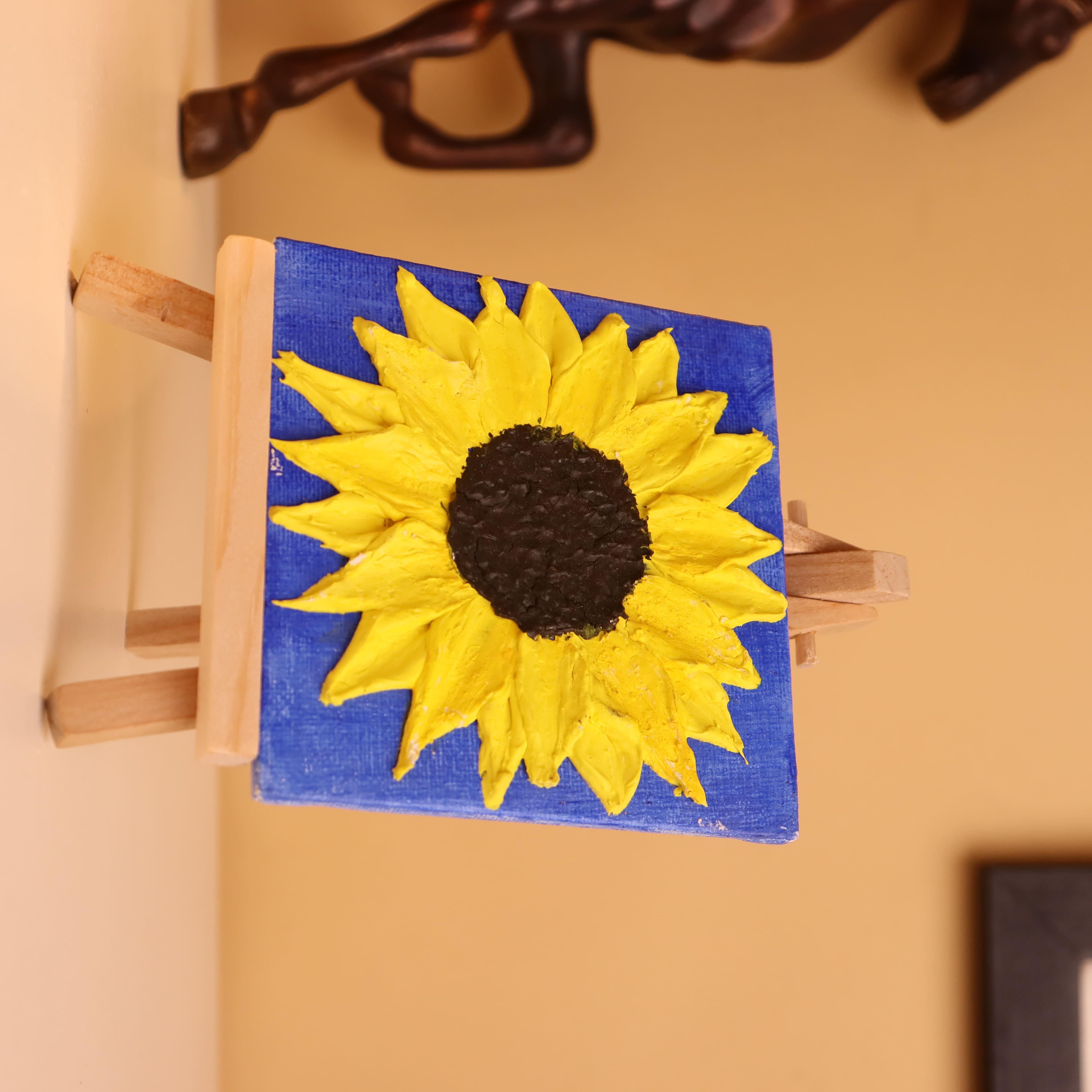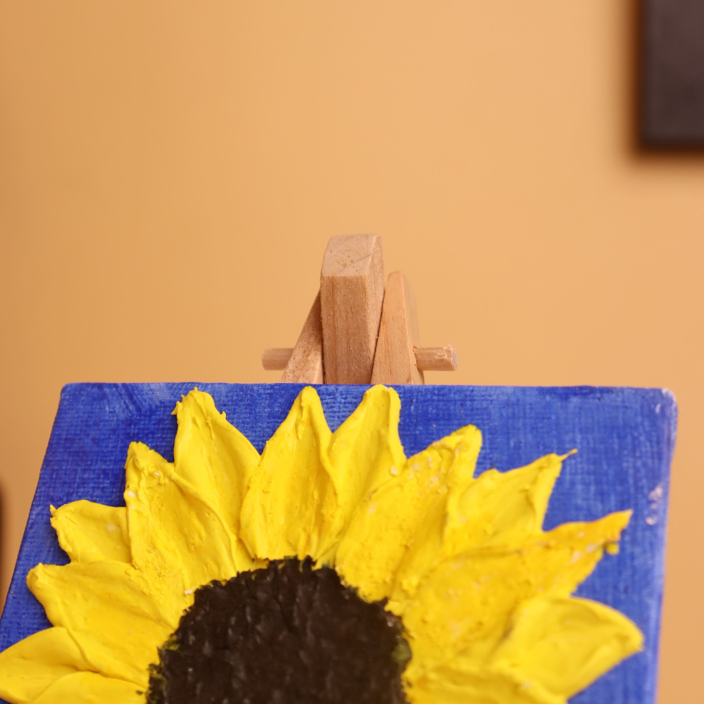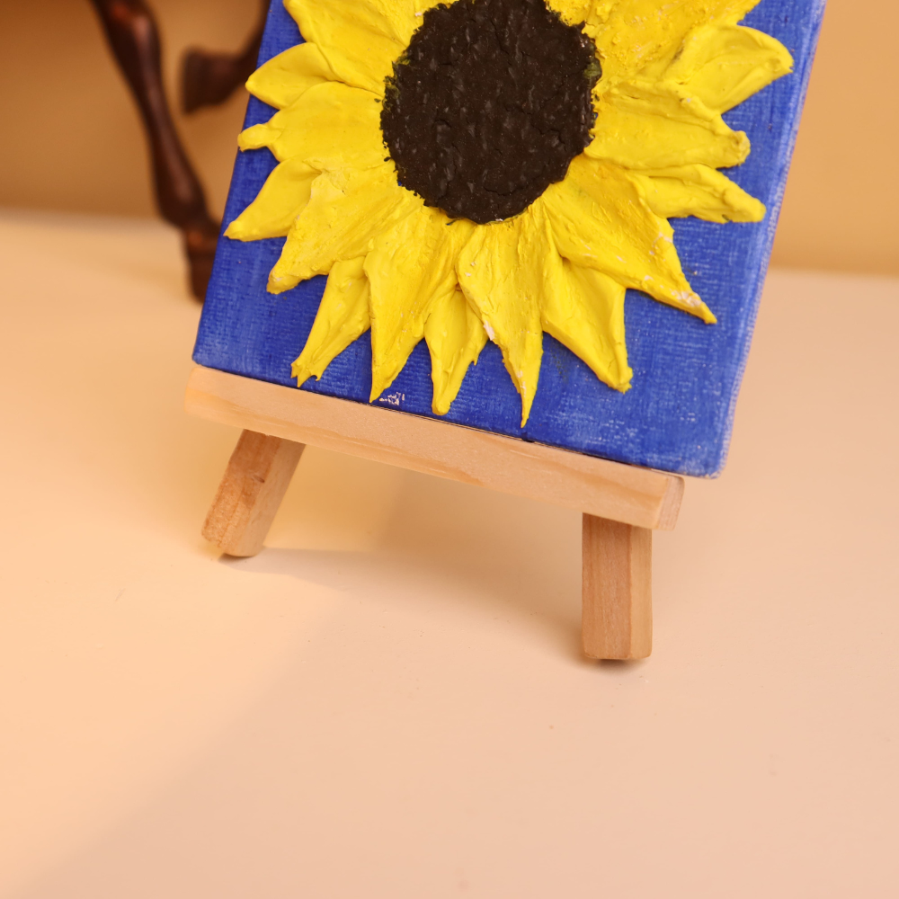 Brighten up your space with this vibrant handcrafted 4x4 inch canvas painting featuring a bold, three-dimensional sunflower. Created using richly textured acrylic paint, this mini artwork brings the sunflower to life with raised petals that you can actually feel. The thick, sculpted strokes create a stunning 3D effect, with vivid yellow petals radiating from a deep black center, all set against a striking cobalt blue background. Each petal is uniquely shaped to give the flower natural depth, shadow, and movement. Mounted on a wooden mini easel, this compact canvas is perfect for desktops, gift tables, or small wall displays. It’s an ideal choice for art lovers, nature enthusiasts, or anyone looking to add a pop of joy and color to their decor. Handcrafted with care, every piece is one-of-a-kind and full of character.