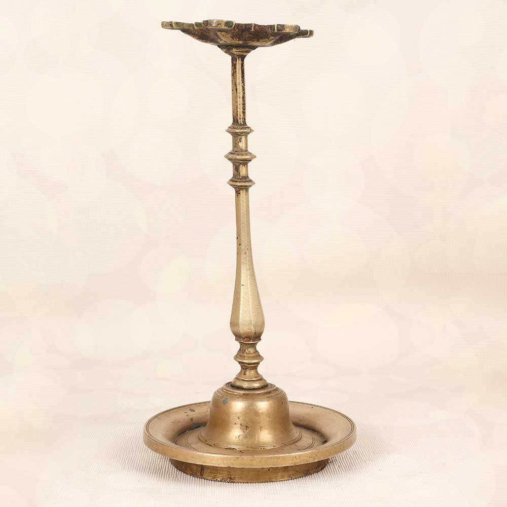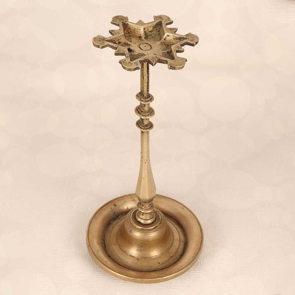 Light up your home with old-world charm. This beautiful vintage brass oil lamp featuring 6 jyots will transport you to a bygone era with its intricate South Indian artisanal craftsmanship. Create a soothing ambiance and highlight your living space's traditional décor with this lamp's vintage aesthetic. The soft, flickering light from its 6 jyots sets a relaxing mood, perfect for winding down after a long day. Place it on an accent table, bookshelf, or mantel to add a touch of nostalgia. Bring old world charm into your home with this gorgeous vintage brass oil lamp. Its handmade quality and functionality make it a statement piece. Give your rooms a cozy feel reminiscent of a past era.