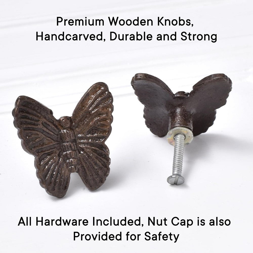 These butterfly knobs offer an antique-inspired look that never goes out of style. The intricate design of the butterfly wings paired with the rich, rustic finish creates a nostalgic, vintage feel. Ideal for those who appreciate classic designs with a playful twist, these knobs complement a wide variety of furniture styles, from shabby chic to industrial, or even contemporary with a hint of eclectic charm.