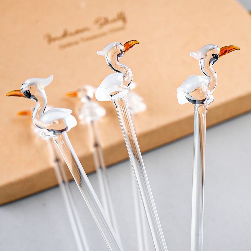 Elevate your drink presentation with this exquisite set of handcrafted glass stirrers featuring delicate Clear Pelican Bird designs on top. Each stirrer is carefully made with clear glass stems and intricately shaped Pelican Bird figures, adding a playful yet elegant touch to your beverages. Perfect for cocktails, mocktails, tea, or coffee, these stirrers combine functionality with artistic charm. Ideal for home use, parties, or gifting, they bring a unique and stylish flair to any table setting.