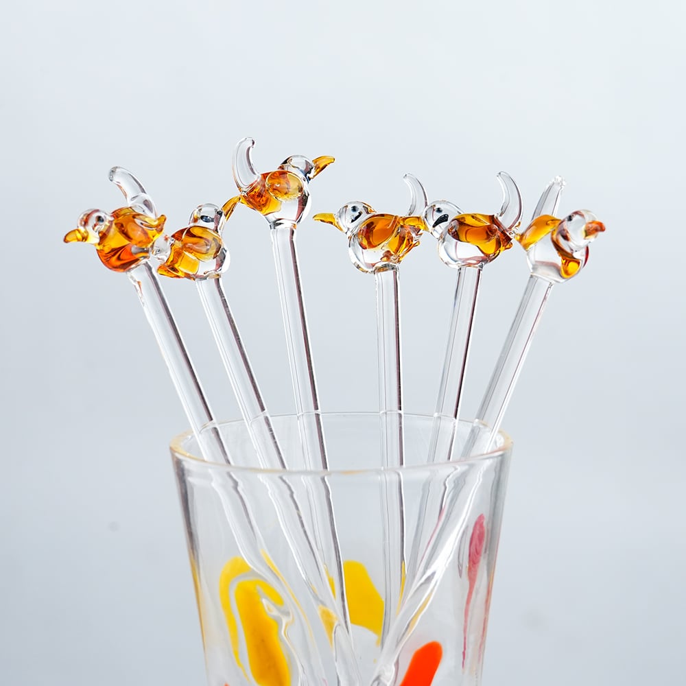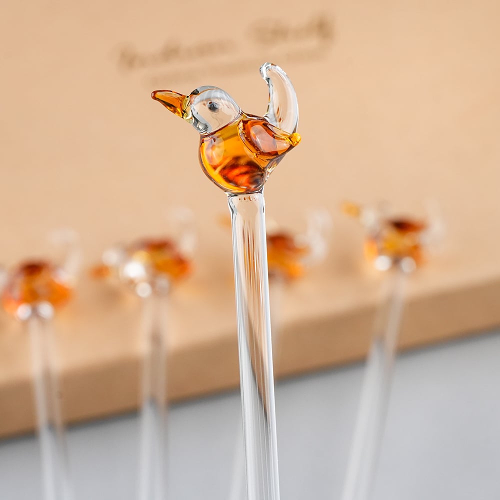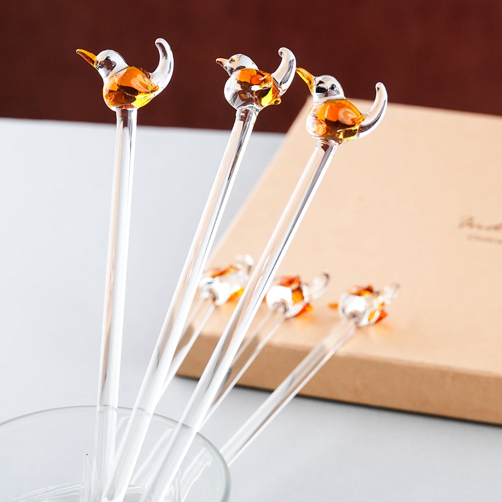 Elevate your drink presentation with this exquisite set of handcrafted glass stirrers featuring delicate bird designs on top. Each stirrer is carefully made with clear glass stems and intricately shaped bird figures, adding a playful yet elegant touch to your beverages. Perfect for cocktails, mocktails, tea, or coffee, these stirrers combine functionality with artistic charm. Ideal for home use, parties, or gifting, they bring a unique and stylish flair to any table setting.