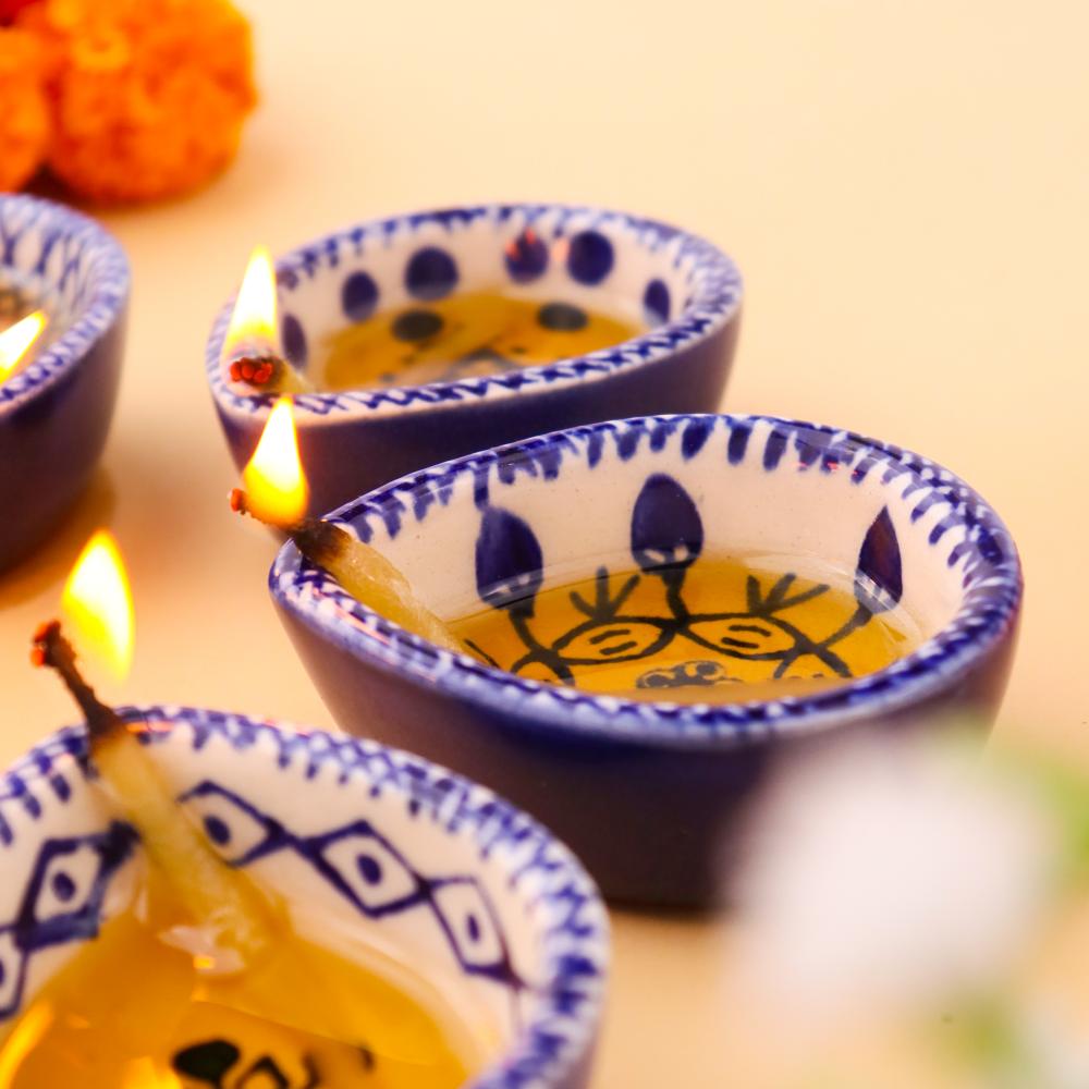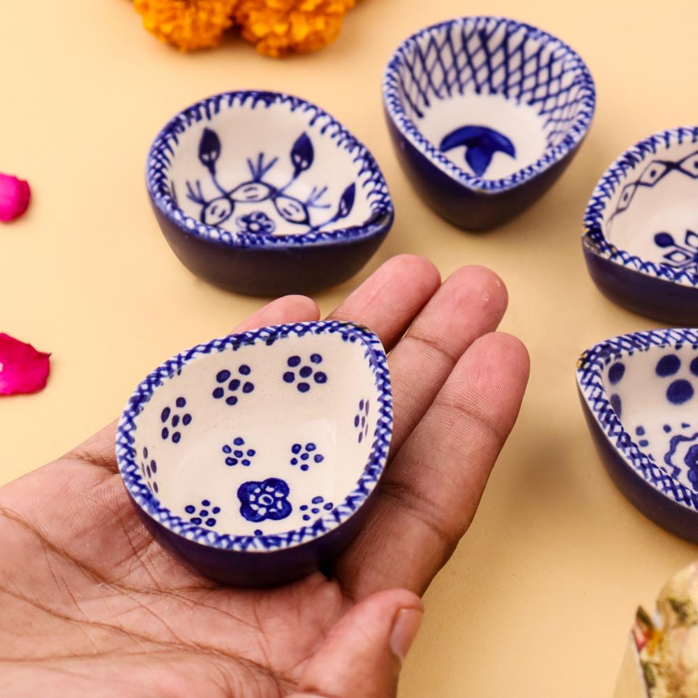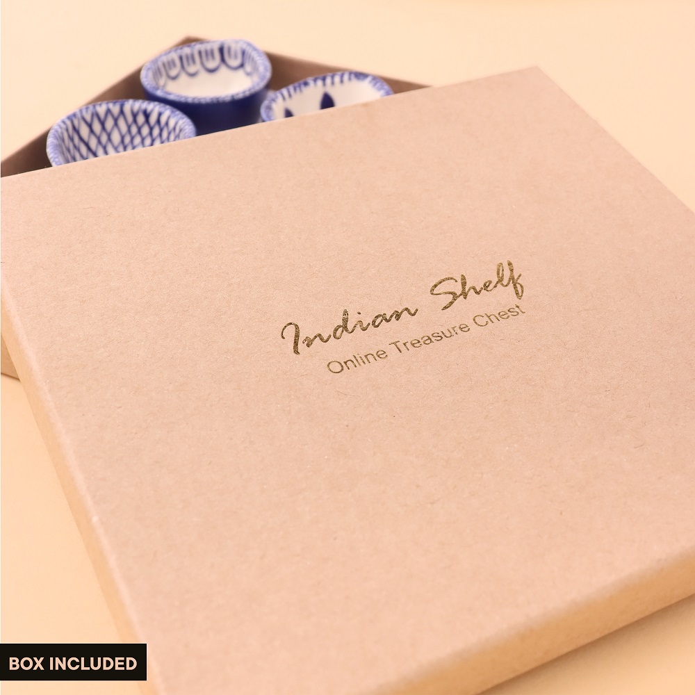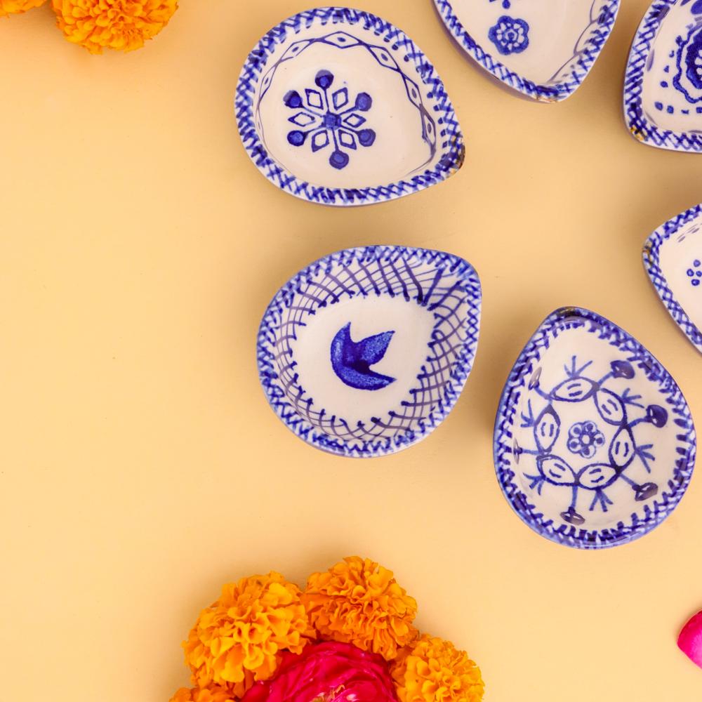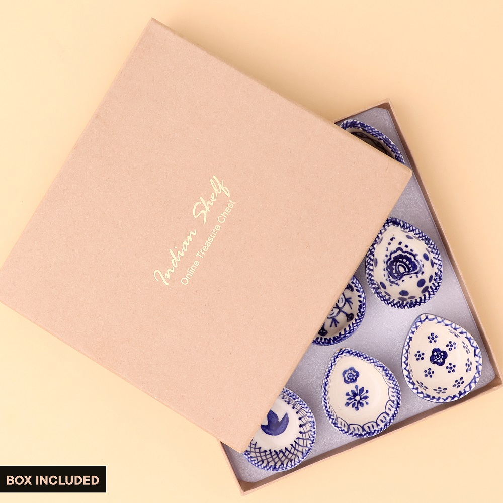 Add elegance and devotion to your mandir with this designer blue and white ceramic Diwali diya, thoughtfully handcrafted by skilled artisans. Each diya features unique hand-painted motifs in indigo blue against a white ceramic base, creating a stunning visual appeal. Compact yet radiant, these diyas are perfect for temple decoration, daily puja rituals, and festive occasions. Their blend of artistry and spirituality makes them a timeless addition to any sacred setting.