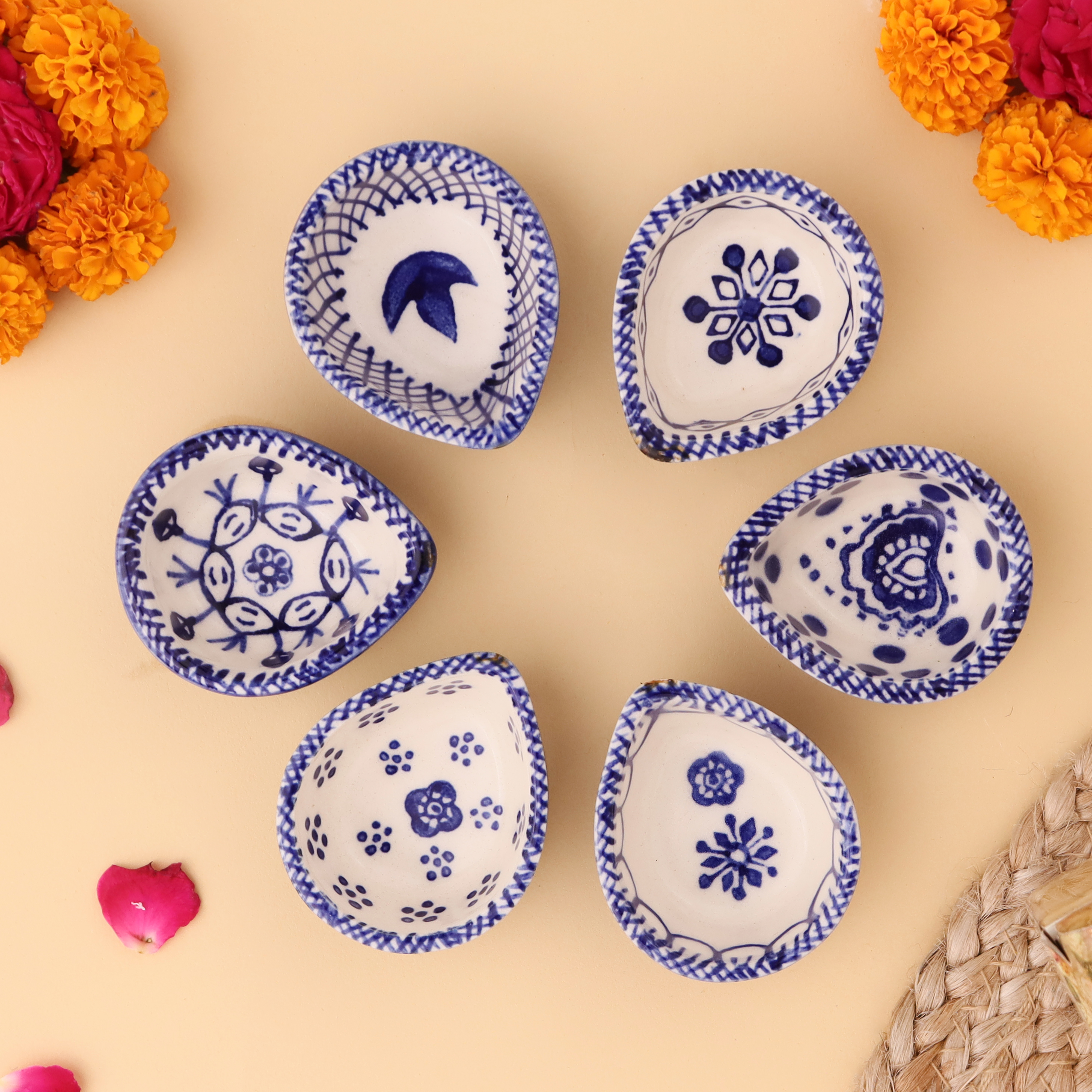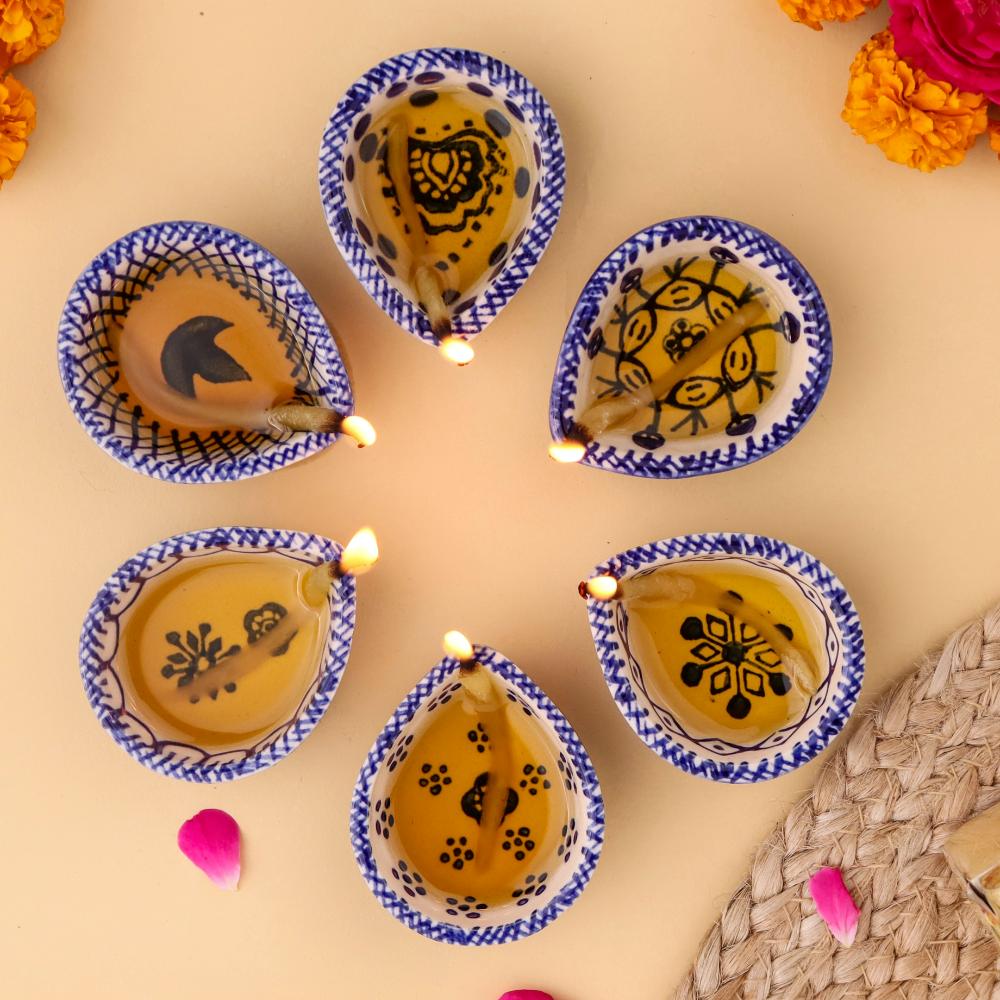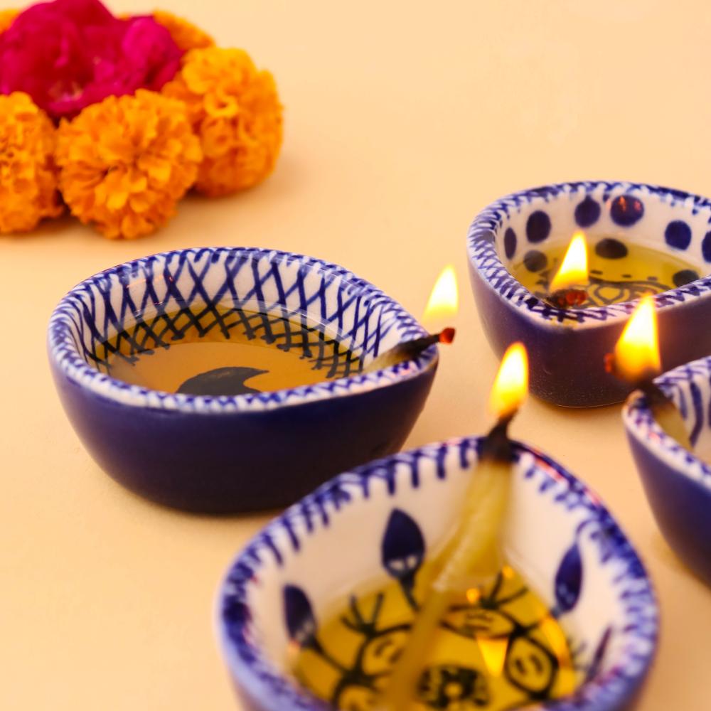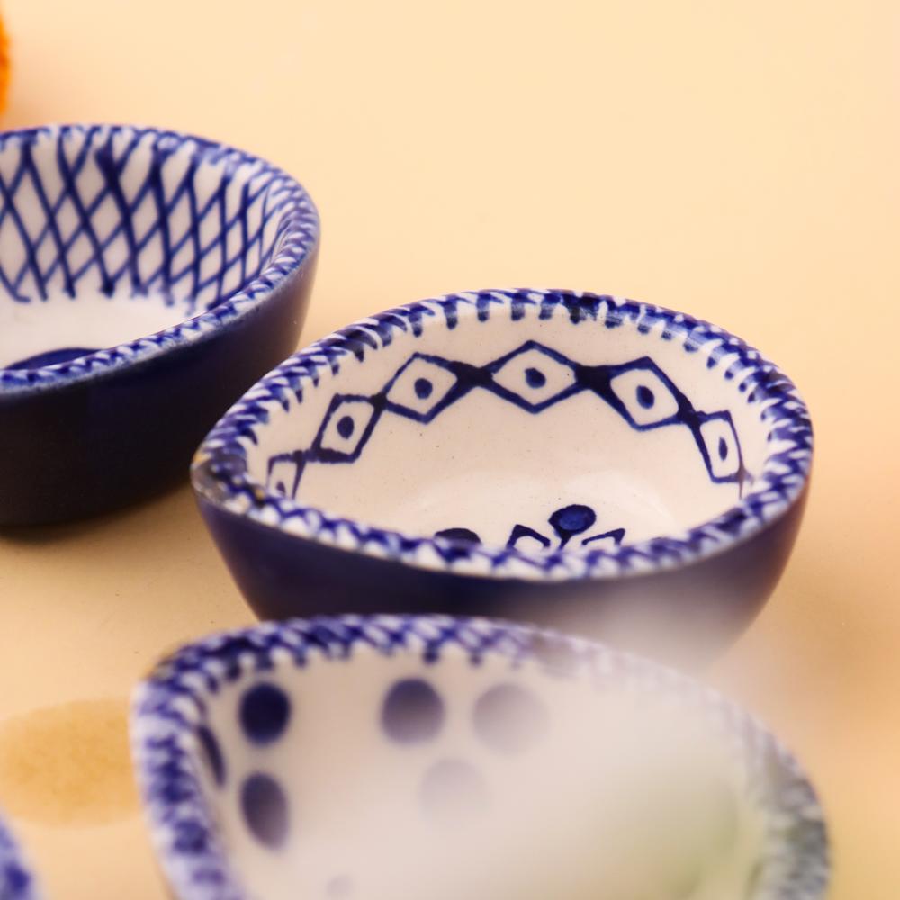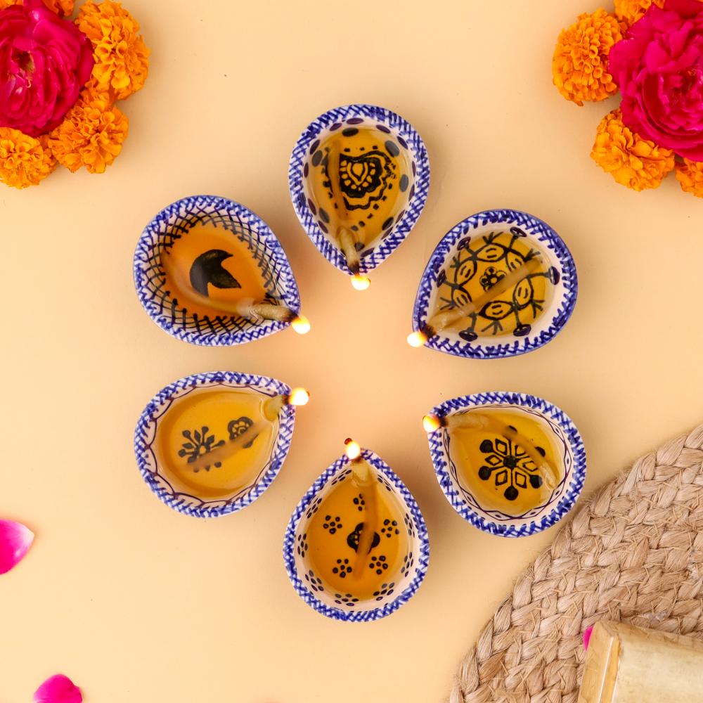 Add elegance and devotion to your mandir with this designer blue and white ceramic Diwali diya, thoughtfully handcrafted by skilled artisans. Each diya features unique hand-painted motifs in indigo blue against a white ceramic base, creating a stunning visual appeal. Compact yet radiant, these diyas are perfect for temple decoration, daily puja rituals, and festive occasions. Their blend of artistry and spirituality makes them a timeless addition to any sacred setting.