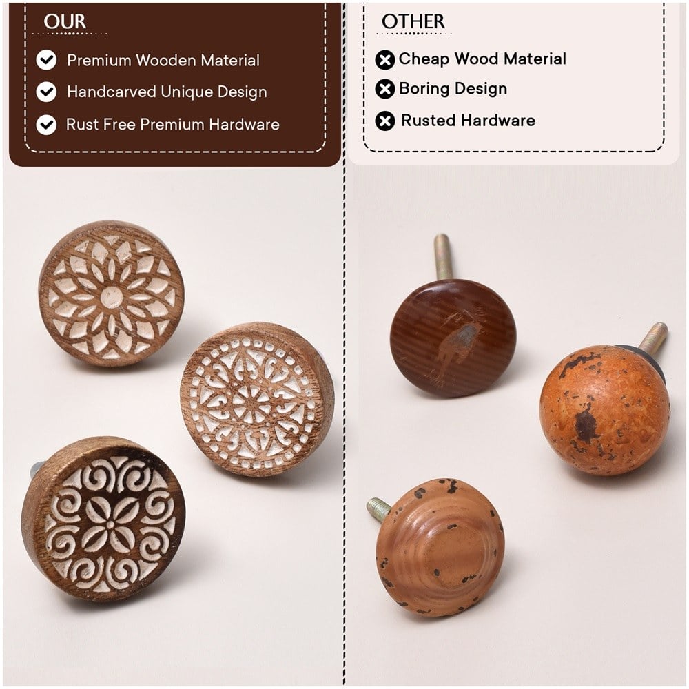 Each knob features a beautifully carved floral pattern, adding an artistic flair to your decor. Constructed from high-quality wood, these knobs are both sturdy and durable, ensuring they fulfill both functional and decorative roles. Their smooth finish and distinctive design make them a perfect fit for various furniture styles, whether traditional or contemporary.