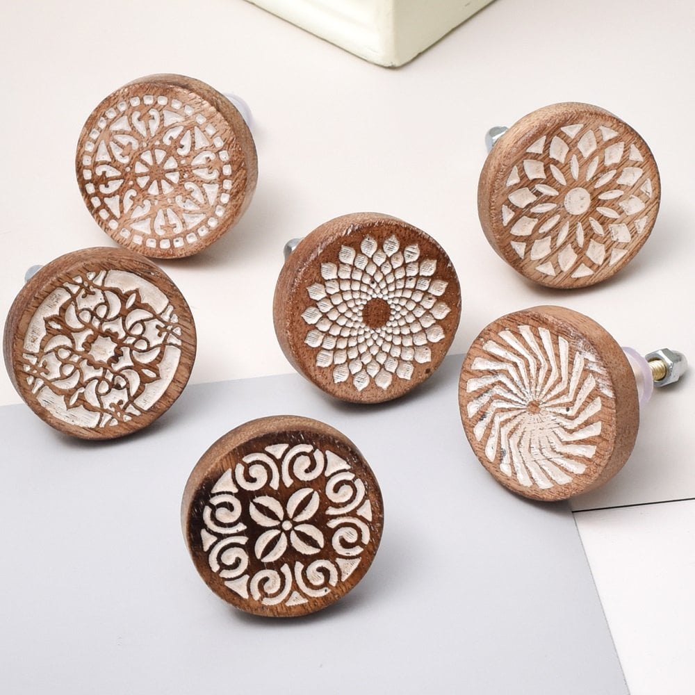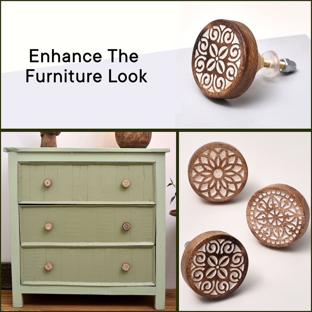 Enhance the beauty of your furniture with these exquisitely crafted Floral Wooden Cabinet Knobs. This set of 6 knobs showcases a detailed floral design that brings a hint of nature and elegance to any furniture piece. Ideal for cabinets, drawers, or any item in need of a stylish refresh, these knobs infuse timeless charm into your home.