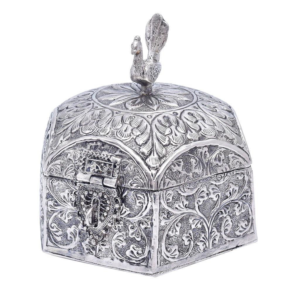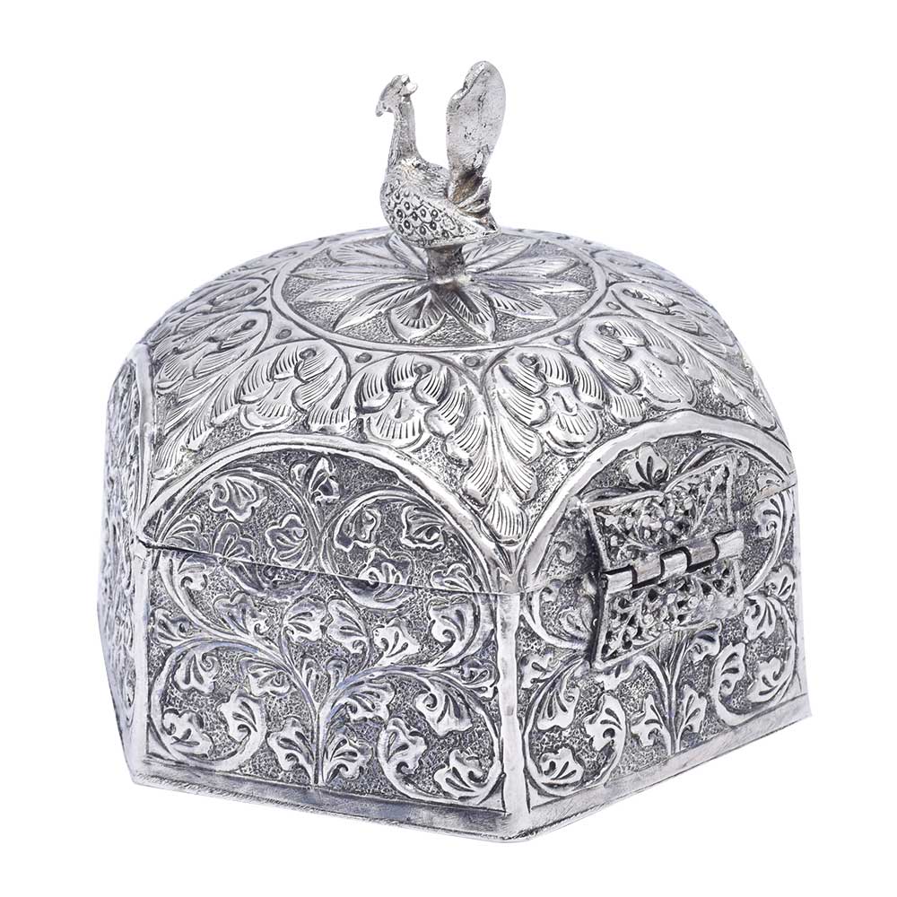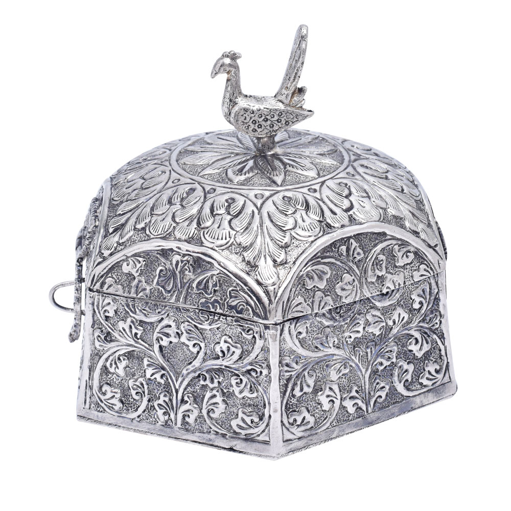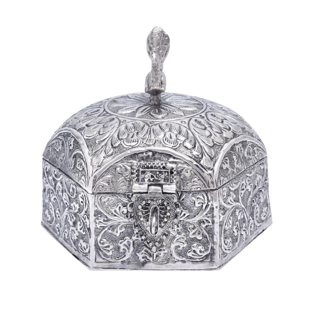 A Carved Silver Plated 6 sided Antique Box is a decorative and functional item made of silver plating on a metal base. It features intricate carving on all six sides, showcasing the skill and artistry of the artisan who created it. This type of antique box is often used to store small items such as jewelry, trinkets, or keepsakes. It is also a popular choice for gifting due to its elegant appearance and timeless design. The silver plating on the antique box provides a reflective surface that can catch the light and add shine to a room. These boxes are highly sought after by collectors of antique silverware and those interested in vintage decorative items. When properly cared for, a carved silver plated 6 sided antique box can last for generations and retain its beauty and value.