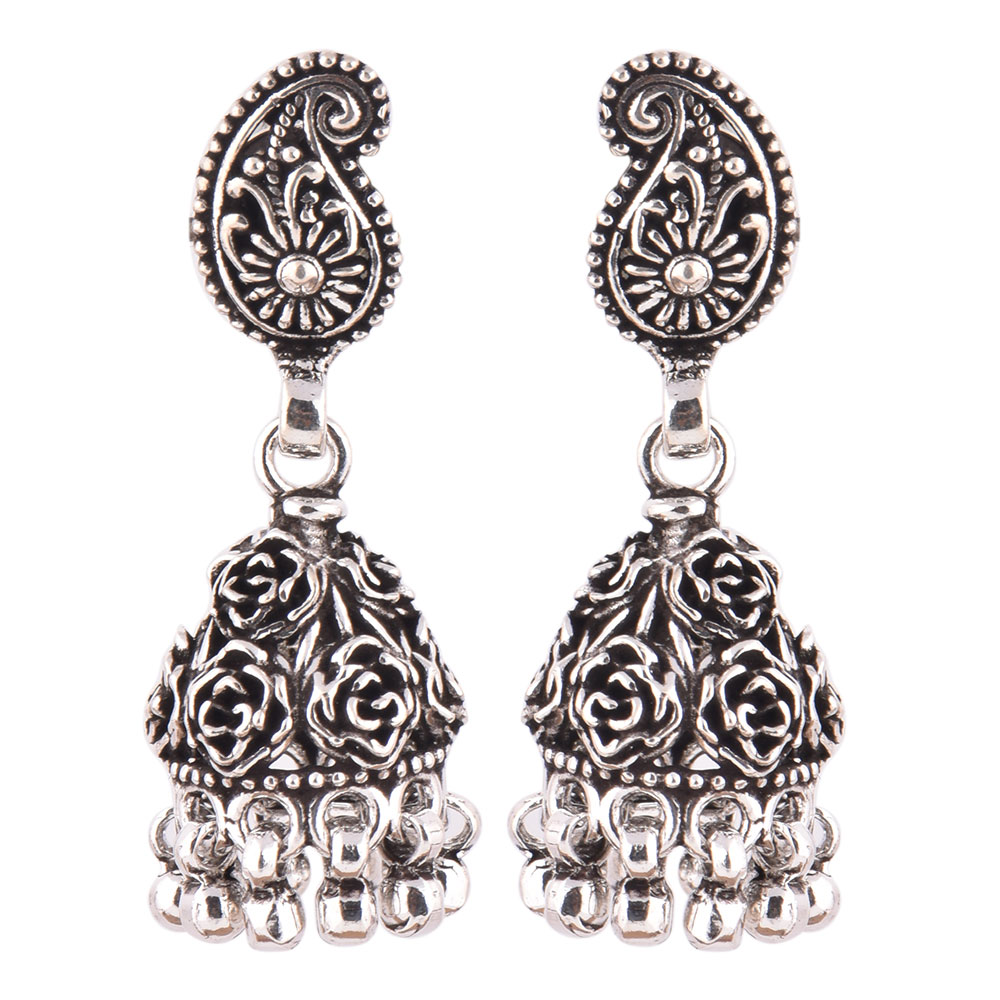 • 92.2 Sterling Silver Earrings Rose And Paisley Engraved Jhumkis