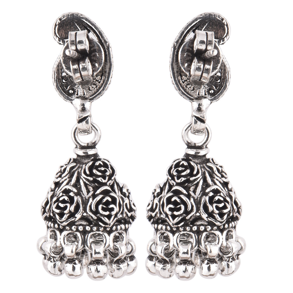 A unique looking 925 Sterling Silver Jhumkis Pair in Dome shape with floral motif on the top with hanging silver bells from our tribal jewellery collection can adorned beautifully with any Indian outfit. Ideal for Work And Casual Wear.
