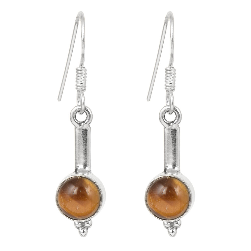• 92.5 Pure Sterling Silver Earrings Ball Design Tiger Eye Stone Dangler Hook Earring