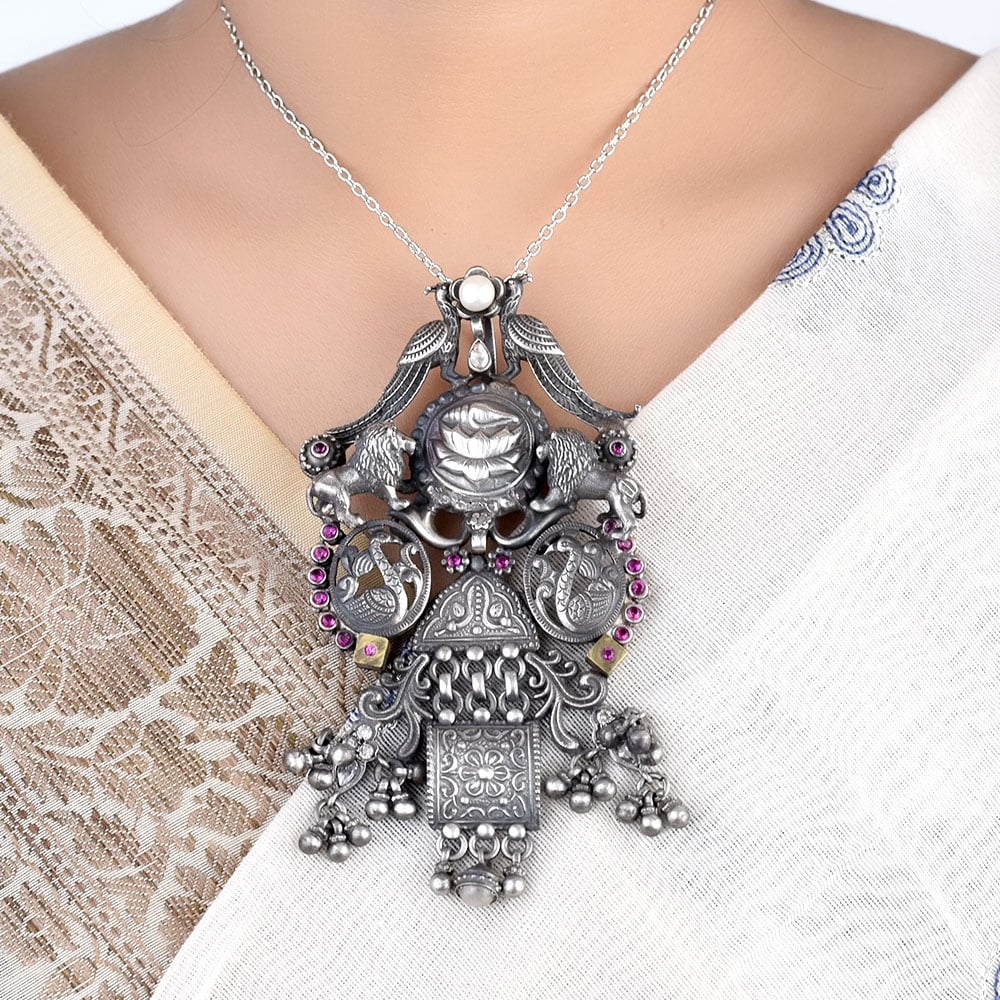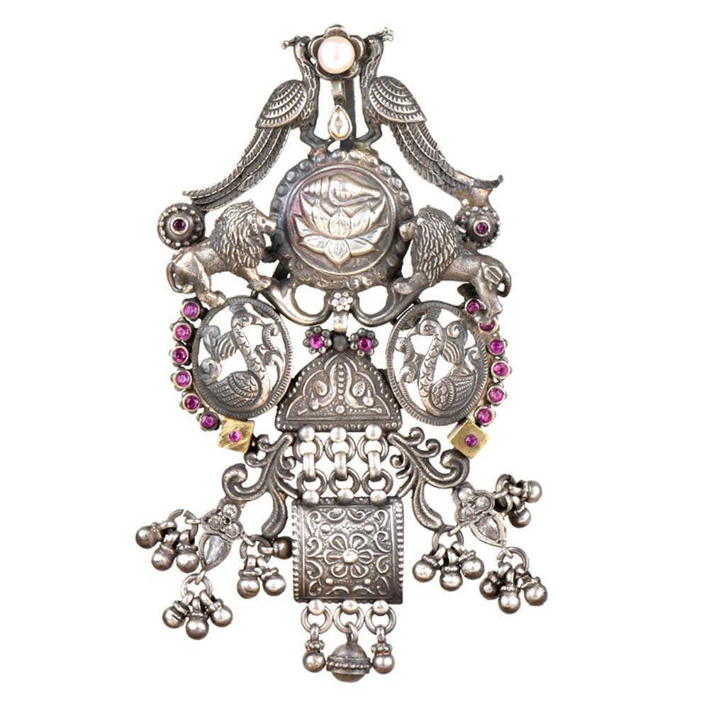 • 92.5 Saterling Silver Pendant Traditional Motifs Lions, Peacocks, Ducks With Lotus flower In Centre
