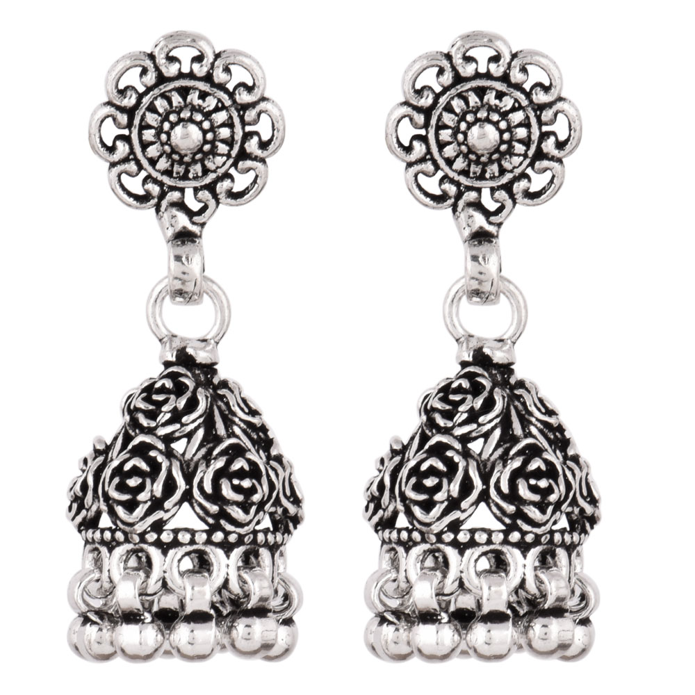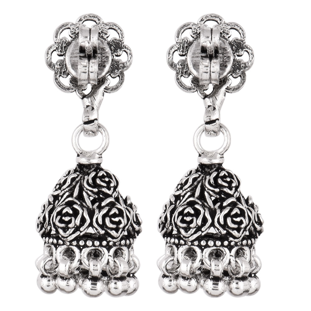• 92.5 Solid Sterling Silver Earring Oxidize Rose Flower Design Jhumka Earring
