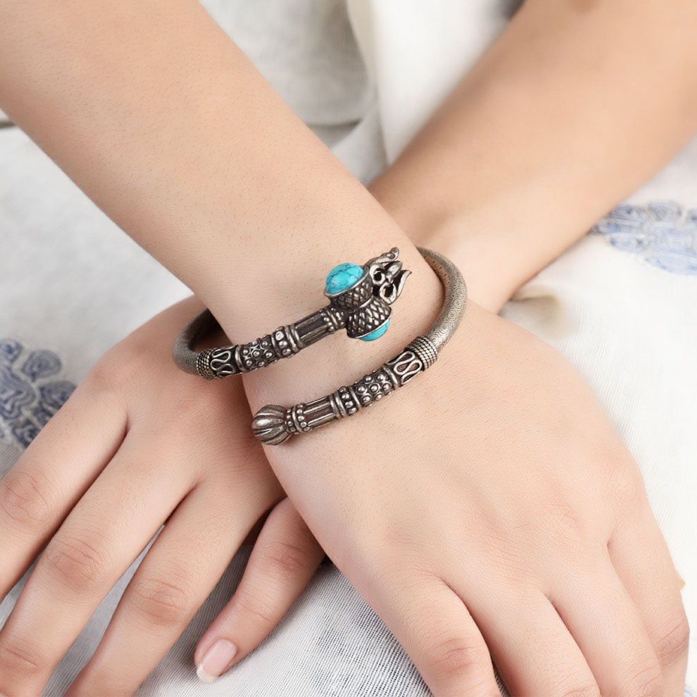 Trishul bangle made in pure 92.5 sterling silver has intricate work with turquoise stone situated inside a dumroo, leading into a Trishul .This Handmade silver bangle can be matched with traditional as well sasual apparels and can be worn to parties, weddings and other auspicious occasions.